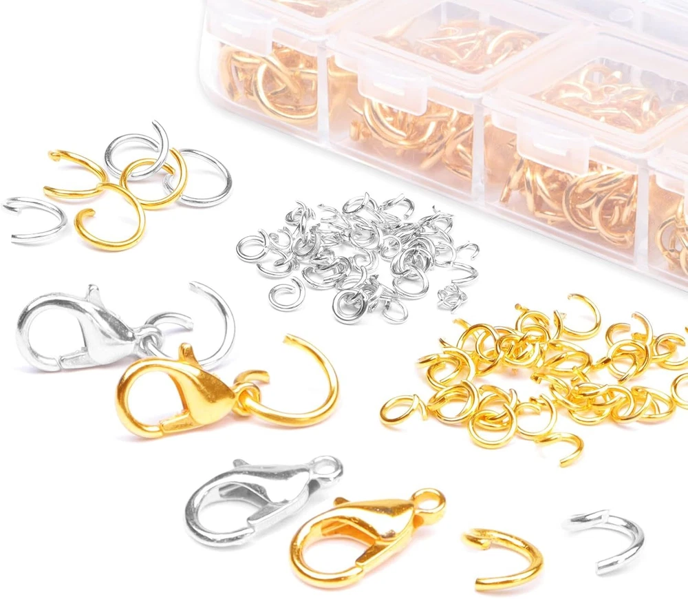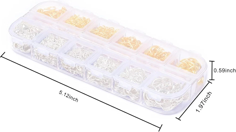 Jump Rings for Jewelry Making Kit, 1200 pcs Open Jump Rings Jewelry Repair Ki PACKAGE INCLUDE: YUGDRUZY Jump rings includes a box of 1200 pieces silver and golden jump rings and lobster claw clasps set, 1 jump ring pliers, 1 tweezers and 1 jump ring opener brass ring. All you need for jewelry making supplies are included PLEASE NOTE: The jewelry making tools are coated with oil to prevent rust. If the jewelry making pliers you received have some oil on the head that make it looks like dirty, please don't worry. Just wipe them clean with a cloth before use. And apply oil to them before not use for a long time to storage, which can helps the pliers keep anti-rust VARIETY SIZES: The jewelry making supplies contains a great selection of sizes jump ring for jewelry making. Five most popular sizes (4 mm ,5 mm, 6 mm, 8 mm, 10 mm) that are good ideal for making your bracelets, repair necklaces and any DIY jewelry projects DIY TOOLS: Our jump rings kit comes with a needle nose pliers and a bonus jump ring opener. The jump ring opener makes opening and closing the open rings easier than holding two pliers. You can hold your chain with the same hand you have the ring tool on, and your pliers in the other hand and assemble away with ease MORE CONVENIENT STORAGE: The jump rings for jewelry making are packed in a 12 separate boxes to keep them separate. The storage container is designed with the lids that can be opened and snapped shut individually as well as all together. It is perfect box to keep the jump rings compartments with individual sizes and saved as a whole, which help your diy scene neat and tidy effectively 1.97 inches x 5.12 inches x 0.59 inches. Weight: 5.9 oz Item model number 3-D-CL-2 Style Open Jump Rings Color White Silver+Gold Material Brass Item Weight 5.9 ounces Number of Pieces 40 Finish Type Oil Product Dimensions 5.12 x 1.97 x 0.59 inches