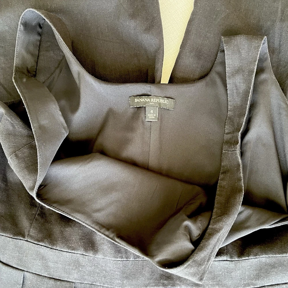 Banana Republic Black Linen Blend Jumpsuit – Women’s Size 4 – Cropped Wide Leg Effortlessly chic and made for warm weather, this black linen-blend jumpsuit from Banana Republic is a versatile staple perfect for both relaxed daytime wear and elevated evenings out. From the Spring 2022 collection, it features a round neckline, cropped wide-leg silhouette, and a tailored waist for a flattering fit. The breathable fabric blend makes it ideal for summer styling. Key Features: • Brand: Banana Republic • Color: Black • Size: Women’s 4 • Season: SP22 (Spring 2022 Collection) • Material: • Shell: 54% Linen, 44% Cotton, 2% Spandex • Lining: 100% Polyester • Style: Cropped wide-leg jumpsuit • Neckline: Round neck • Sleeves: Sleeveless with wide straps • Closure: Concealed side zipper • Pockets: Side seam pockets • Fit: Tailored waist with front pleats for shape. Condition: Excellent pre-owned condition. No rips, stains, or major flaws. Please see all photos for details. If you’d like to see more pictures of the item, don’t hesitate to ask! Flat Measurements (approximate, taken laid flat): • Pit to Pit (Bust): 17.5” • Waist (at narrowest point): 15.5” • Inseam: 22” • Overall Length (shoulder to hem): 50” . Rise (from waistline): 13” I accept returns within 14 days of delivery; however, the buyer must contact me within 3 days of receiving the item. If there is any problem or the item is not as desired, please reach out to me first. The buyer is responsible for return shipping costs and must provide tracking information. A full refund will be issued once I receive the item in the same condition it was sent. I do my best to take accurate pictures, but please note that colors may appear different in real life due to lighting and screen settings. I strongly urge buyers to check the provided measurements and compare them with their own before purchasing to ensure a proper fit. The item is not visibly worn or unclean, but I do not launder pre-owned clothing before shipping. I recommend following the care instructions on the label upon receipt. I do my best to remove any lint, but a few stray fibers may still be present. Check out my other listings—I’m happy to offer a bundle discount if you’re interested in multiple items! Let me know if you’d like a new trendy 80-character title as well!
