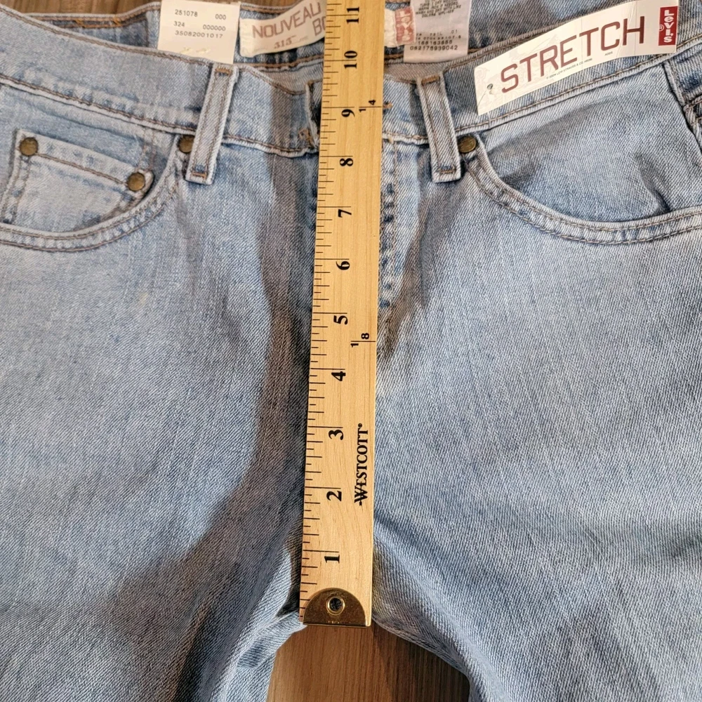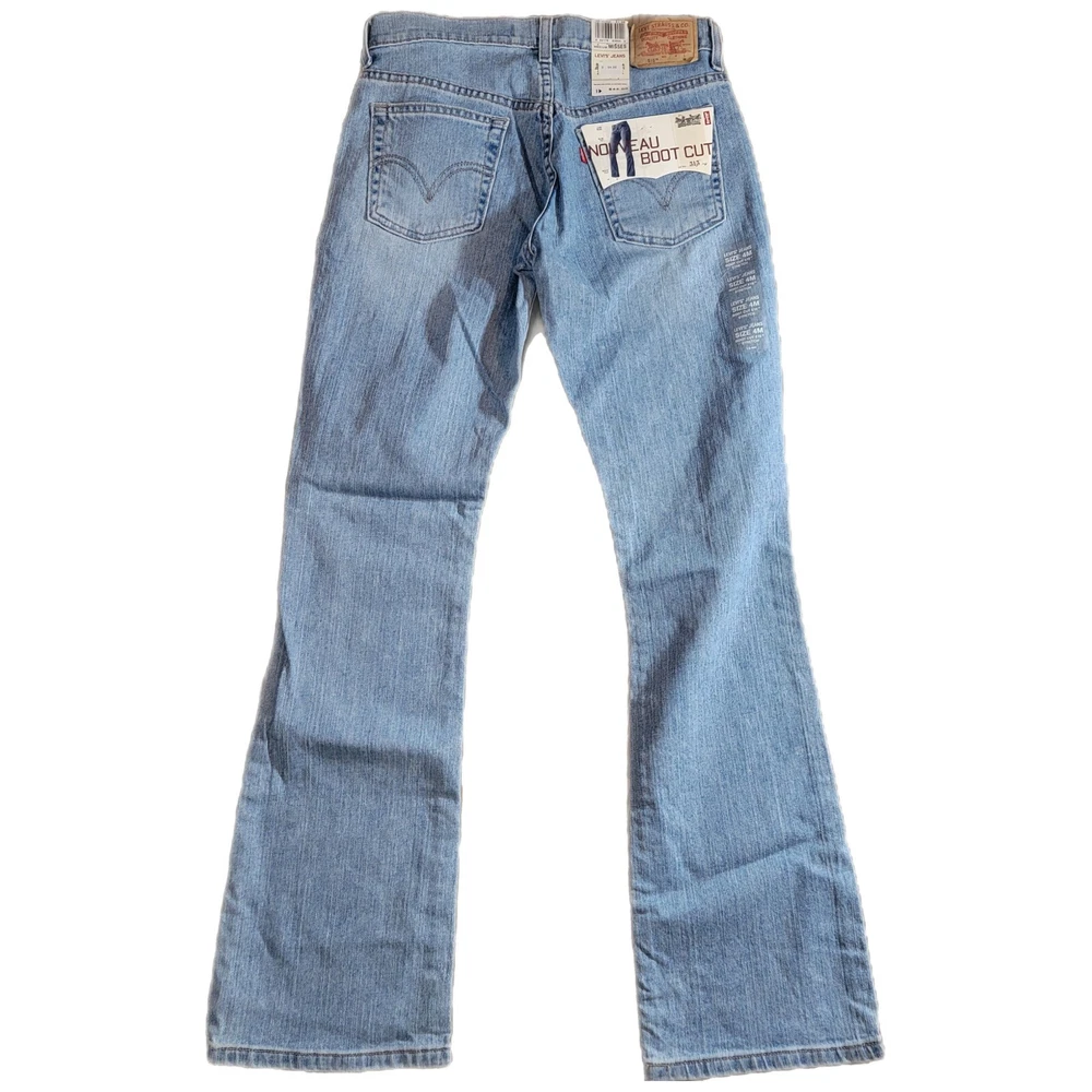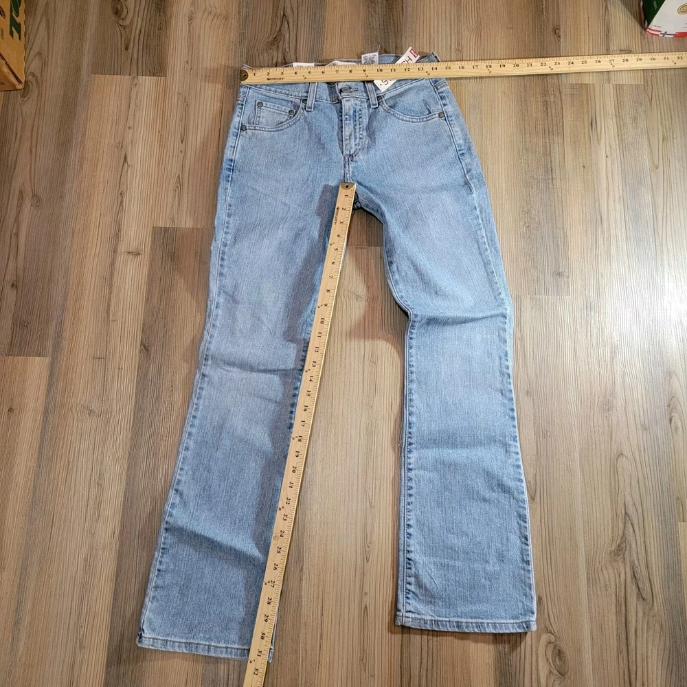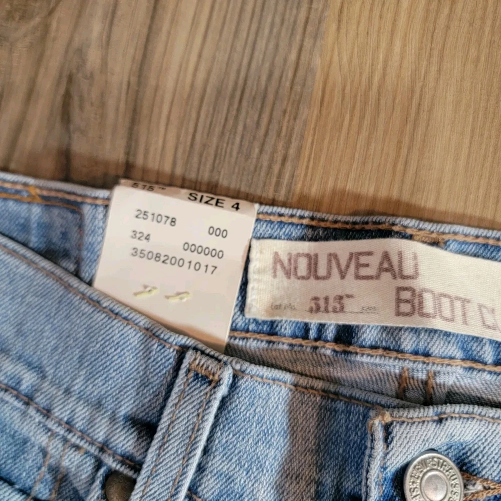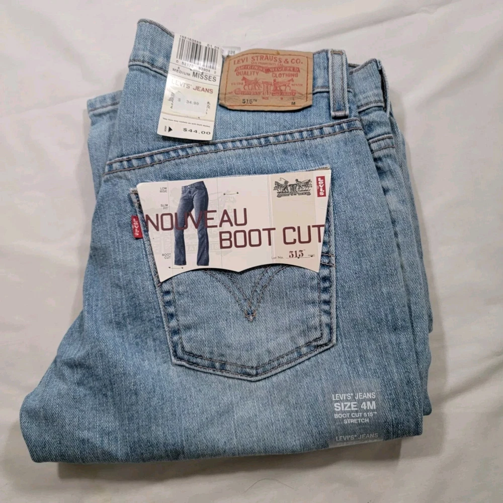 This is a pair of Junior's Levi's 515 Bootcut Jeans in size 4 with a light wash. The jeans feature a solid denim fabric with a mid-rise waist size of 28 inches and a 32-inch inseam. The closure is a combination of a zipper and button, accented with buttons, zippers, and a logo. Made from a comfortable cotton blend material with stretch, these regular fit jeans are designed with pockets and are suitable for casual wear.