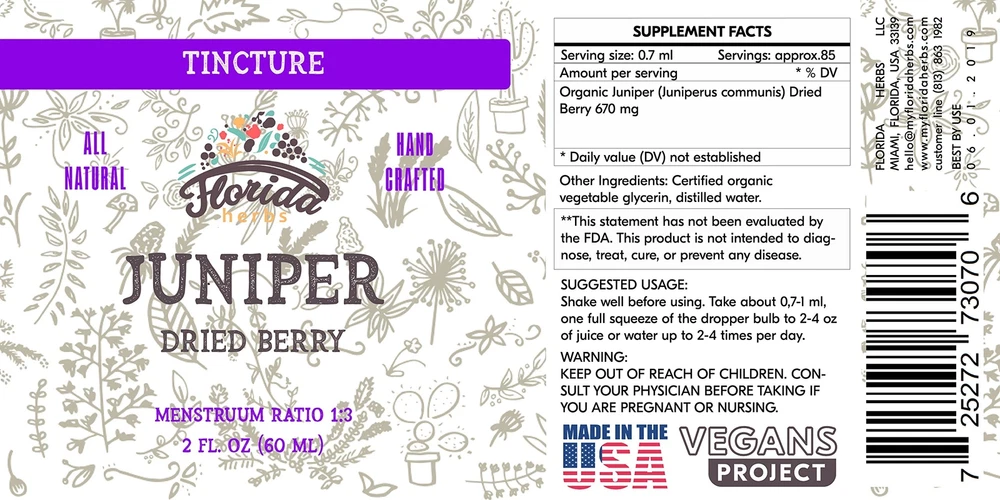 Juniper is a short to a medium-height tree that grows wild in some parts of Europe, North America, and Asia. There are many varieties of juniper, but Juniperus communis is the most common in North America. People use the juniper berry to make medicine. Medicinal preparations include the extract of juniper berry, as well as the essential oil of juniper berry. Don’t confuse juniper berry oil with cade oil, which is distilled from juniper wood (Juniperus oxycedrus). Organic Juniper Extract: Non-GMO, Vegan, Gluten-Free, Alcohol-Free, Made in the USA, About - All products are manufactured in the sunny state of Florida. Florida Herb's is a company that produces products from certified organic grasses or wild herbs. All suppliers have licenses or . Our products - It's commonly known fact that the best quality products are produced in the U.S. We try to excel ourselves and existing standards in quality and in serving our regular buyers. Feel free to try our products and you'll see why our customers choose . Enjoy! OTHER NAME(S): Baie de Genévrier, Common Juniper, Common Juniper Berry, Enebro, Extract of Juniper, Extrait de Genévrier, Genévrier, Genévrier Commun, Genievre, Genièvre, Ginepro, Huile de Baies de Genévrier, Huile de Genévrier, Juniper Berry, Juniper Berry Oil, Juniper Extract, Juniper Oil, Juniperi Fructus, Juniperus communis, Oil of Juniper, Wacholderbeeren, Zimbro. JUNIPER EXTRACT: Hormones free, preservatives free, without artificial ingredients, without antibiotics, gluten free, wheat free, dairy free, sugar-free, soy free, free. HIGHEST QUALITY ORGANIC JUNIPER TINCTURE (Juniperus communis) - products consist entirely of pure ingredients, including wild plants and certified organic ingredients. ORGANIC JUNIPER BERRY form aims to deliver purest high-quality organic products. goal is to manufacture products for a healthy lifestyle and help you reach your perfect state of .