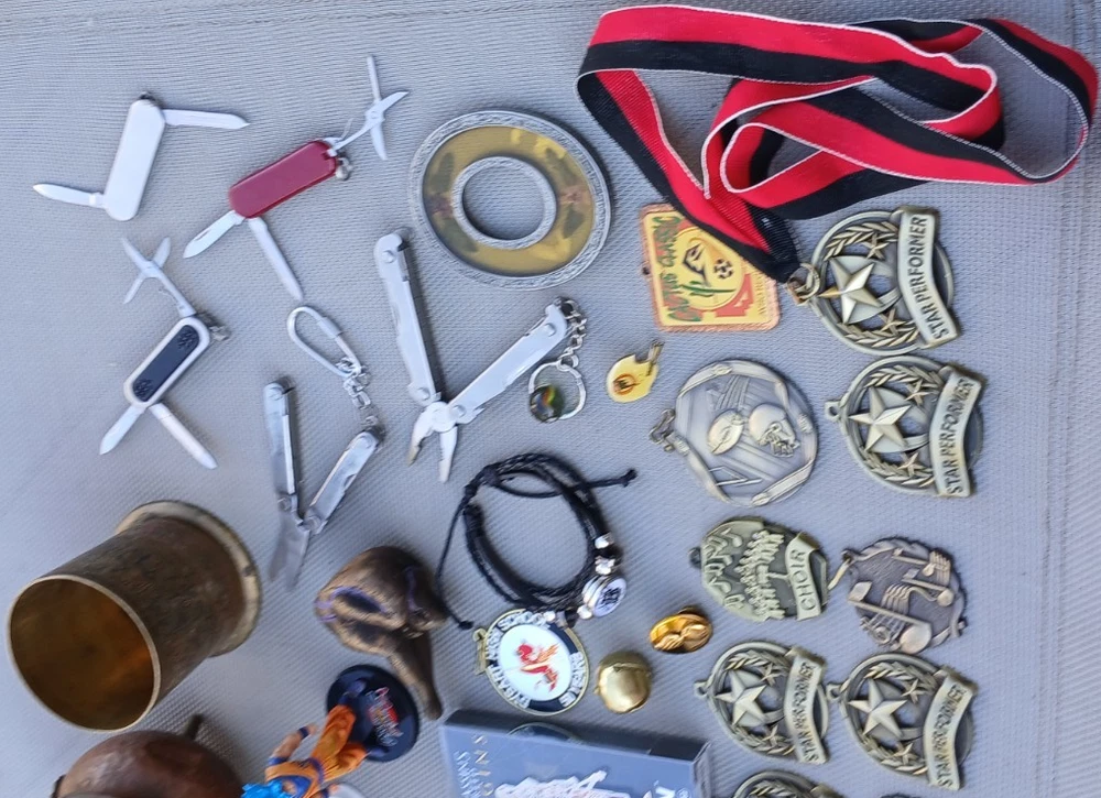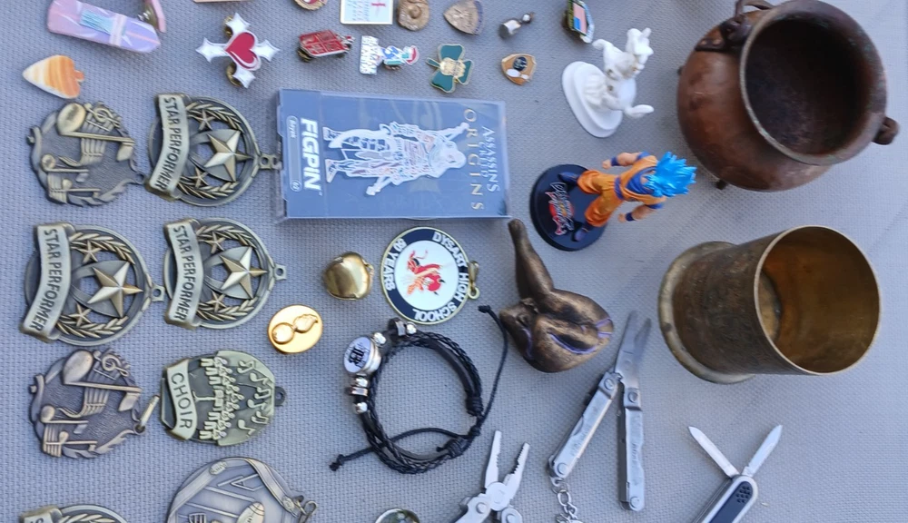 This is a LOT collection of 50+ miscellaneous odds and ends , as well as collectible items . This lot is perfect for individuals who enjoy collecting a variety of items or for those looking for unique pieces to add to their collection. The unit is packed with a mix of items that are sure to appeal to a wide range of collectors with different interests. Thanks for looking and happy bidding! You will receive everything in all the photos! (over 4 lbs!) Contents: Mura Dynamic Microphone Works Great! Klein Tool Inc. Hawkbill Knife w/synthetic orange handles Official emblem Razorback Fan magnet (signed) Encased "Napa Filter" blue handles pocketknife collectable 1 car collectable Brass mini-Caudron pot (a couple dents as shown in pics) Brass container with ornate/intricate design White porcelain Unicorn (Schmid 1981) collectable Oriental designed mini tin container w/lid 2 micro-tools 3 mini pocketknife multi-tools Corded bracelet with initial "B" (adjustable size) Several Medals w/lanyard Several pins of various kinds 1 pair unique earrings Dragonball Fighter 2 resin figurine Assassin's Creed Origins Figpin Bayek #62 (Collect them all!) 2 Large pins "The Jerry Lewis Labor Day Telethon" and "Spin the Bottle" Miami Dolphins football helmet collector pin other items Check out my "Buy it Now" and other live auctions, please. ONLY ships to the lower 48 states. God Bless!