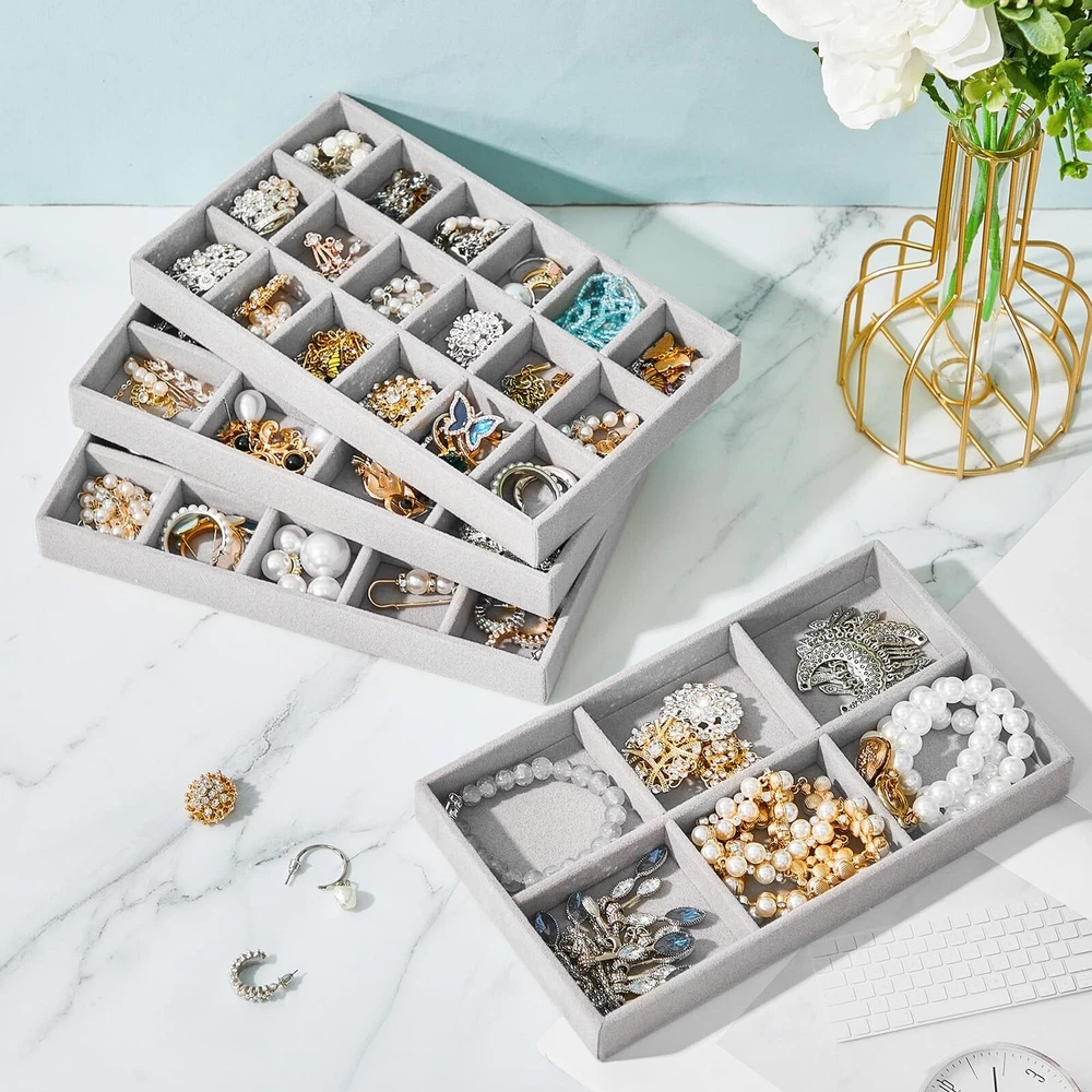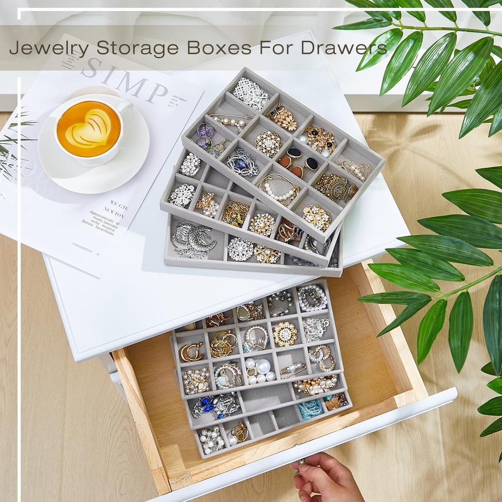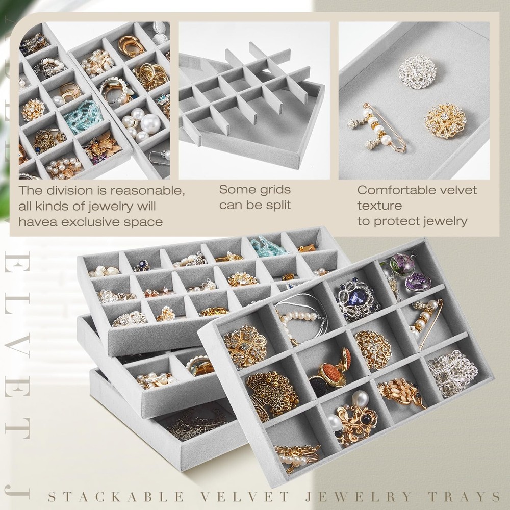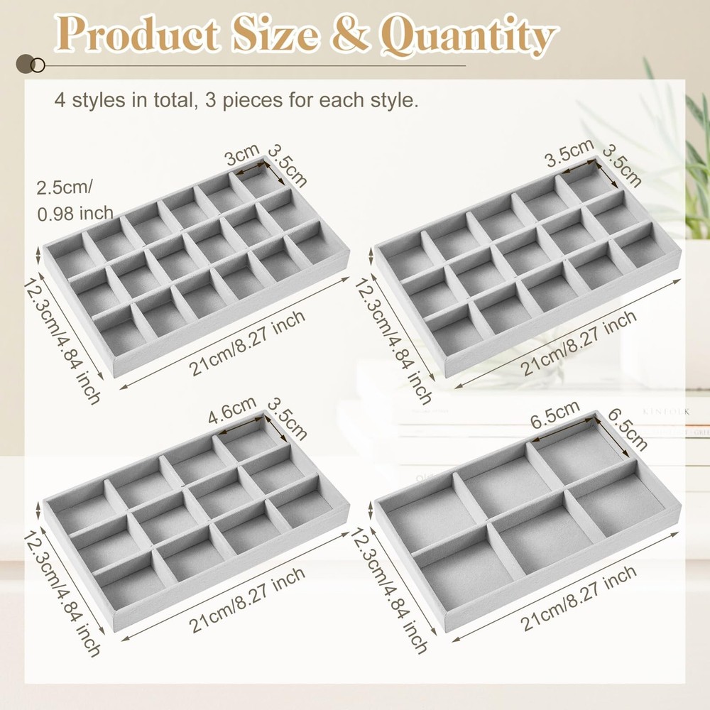 Junkin 12 Pcs Jewelry Tray Velvet Stackable Jewelry Organizer Trays Divided Earring Accessories Storage Containers Box - Buy Now with Fast Shipping! Junkin 12 Pcs Jewelry Tray Velvet Stackable Jewelry Organizer Trays Divided Earring Accessories Storage Containers Box Product Details Date First Available ‏ : ‎ September 12, 2023 Manufacturer ‏ : ‎ Junkin Brand, Seller, or Collection Name: Junkin Material: Velvet Item Length: 6.29 inches Key Features Product Description