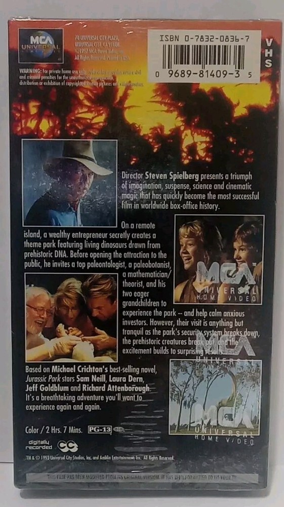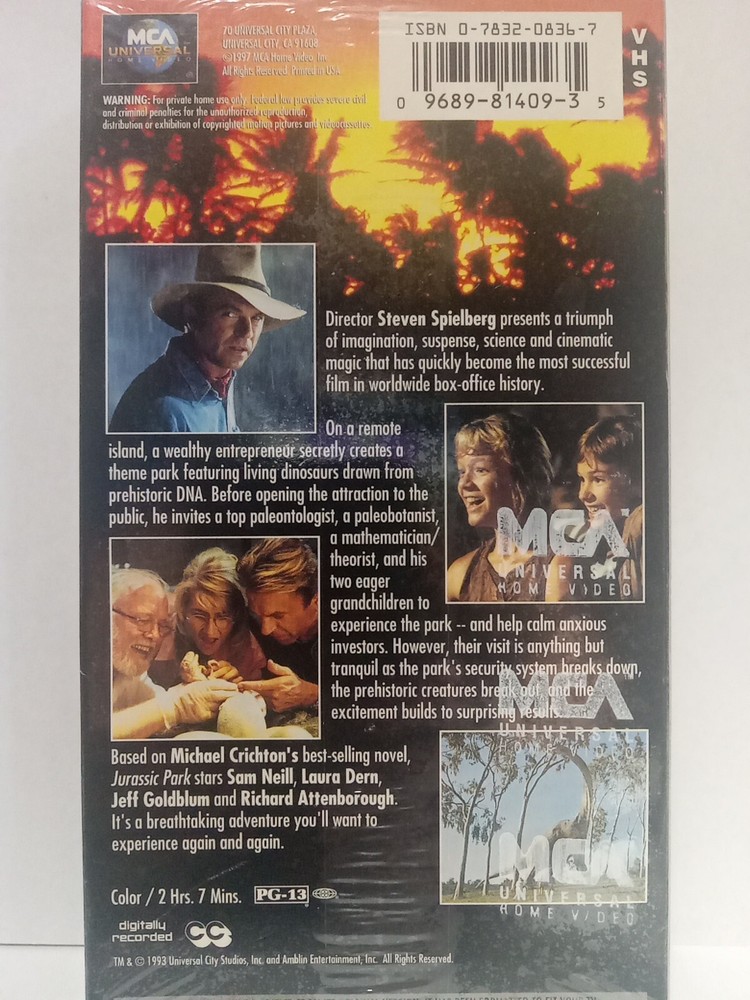 Experience the thrill of the Jurassic Park movie with this VHS tape, featuring the original version from 1993. Directed by Steven Spielberg and starring Jeff Goldblum and Sam Neill, this sci-fi and fantasy film is a must-see. The tape is factory first print, with a watermark and still sealed, ensuring that you get the best viewing experience. This VHS tape is compatible with NTSC signal standards and has a PG-13 rating. The audio language is in English, and the studio behind the film is MCA. The movie is set in the United States and is perfect for fans of the genre. Get your hands on this classic piece of cinema history today.