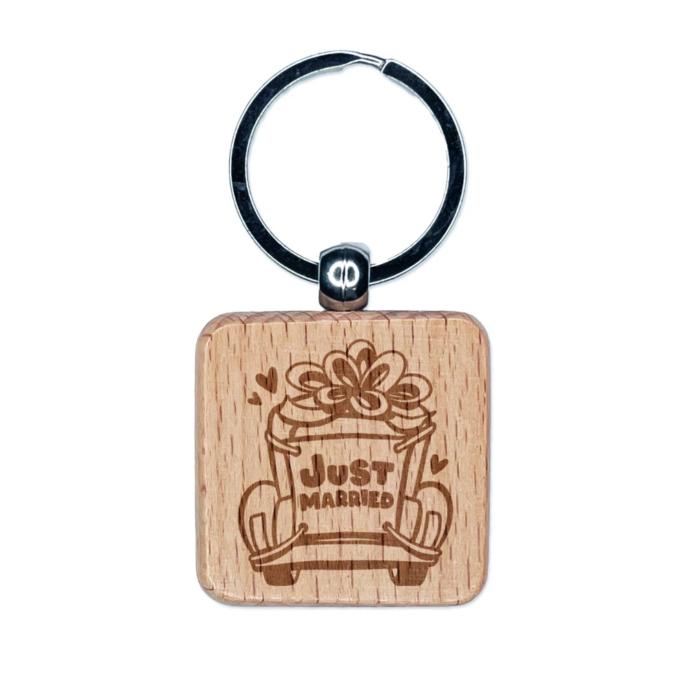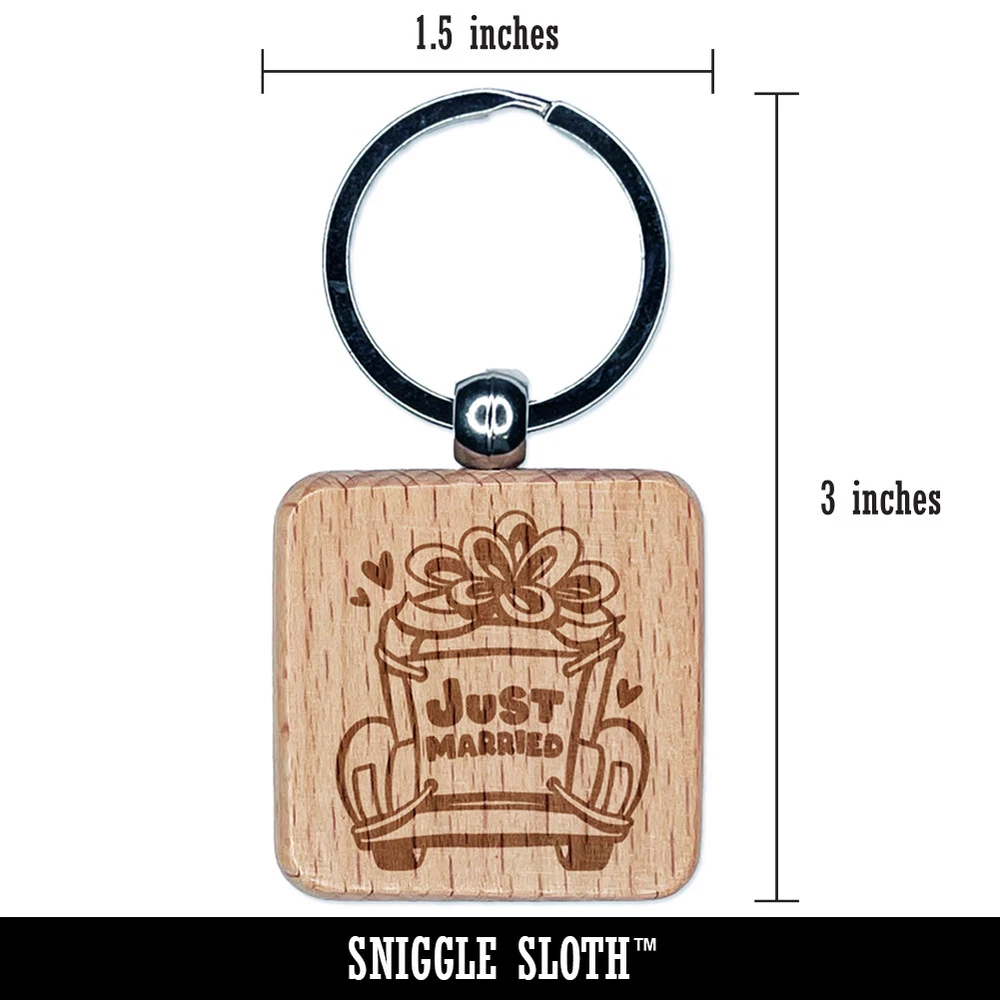 Just Married Vintage Car with Bow Engraved Wood Square Keychain Tag Charm