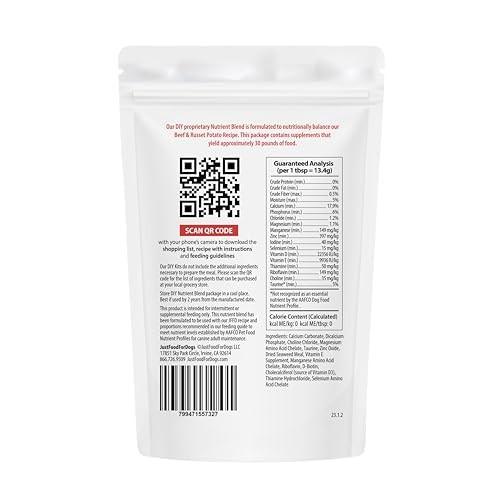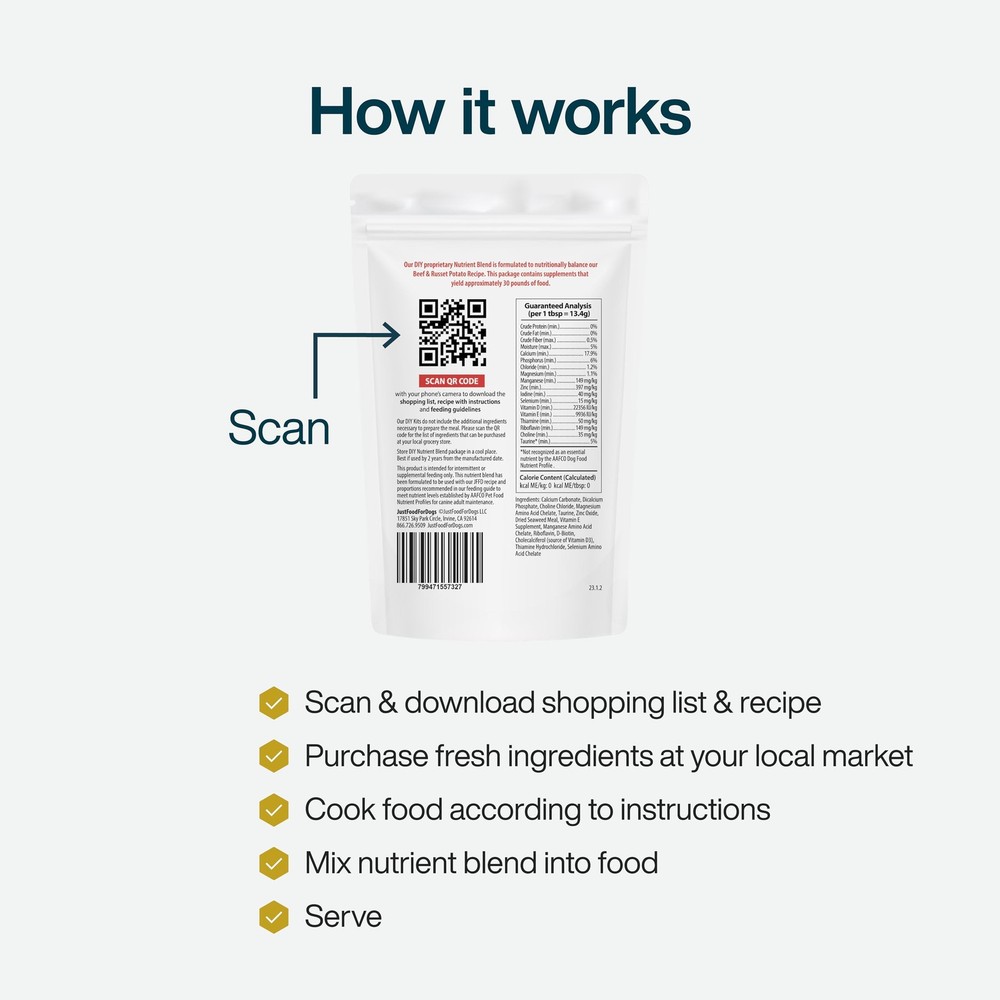 JustFoodForDogs DIY Nutrient Blend for Homemade 4.55 Ounce (Pack of 1), Description The Beef & Russet Potato Recipe is one of our most popular diets, and with our Do It Yourself Nutrient Blend for homemade dog food, you can now make this nutritionally balanced* recipe fresh from your kitchen. This higher-calorie recipe is gluten-free, and grain-free, and incorporates lean ground beef, russet potatoes, sweet potatoes, green beans, carrots, beef liver, green peas, and apples. The result is a wholesome, fully balanced* diet that's perfect for active adult dogs and/or underweight dogs. We make cooking at home for your dog easy! You supply the whole-food ingredients, we supply the recipe and shopping guide, the nutritionally balanced nutrient blend, and easy-to-follow cooking instructions. Our DIY Nutrient Blend creates a complete and balanced meal when made following our recipe instructions. Our DIY Nutrient Blends alone do not constitute a balanced meal, which is why they're described as "intended for intermittent or supplemental feeding." Please use the Cooking Guide to purchase ingredients at your local store or market. Our DIY meals are only nutritionally balanced for long-term feeding when following our exact recipe and using the respective Nutrient Blend. Features: PROMOTES HEALTHY COAT & SKIN: The beef recipe promotes a healthier coat and skin by boosting your furry friend's immune system with wholefood ingredients. COOKING GUIDE INCLUDED: Each Nutrient Blend for homemade dog food comes with full recipe and step-by-step cooking instructions to ensure your dog gets a well-balanced diet. FOR COMPLETE & BALANCED HOMEMADE DOG FOOD: The Beef & Russet Potato DIY is a Proprietary Nutrient Blend perfectly balanced for active adult dogs or underweight dogs. VETERINARIAN DEVELOPED: Nutrient Blends are formulated specifically for each recipe to meet AAFCO recommendations. The blend is compounded from 100% human-grade nutraceuticals regulated by the FDA. Product Details: Handling We will ship all orders within 1 business day of payment. Delivery We Do Not Ship Outside of the Continental US. Return Policy All items qualify for returns within 30 days of receipt. Buyer is responsible for return shipping on any item that is not damaged. Feedback We take our reputation seriously, we buy and sell online, so we understand the value of trust. If you are unsatisfied with your order, please contact us and we will work with you to resolve it to your satisfaction.