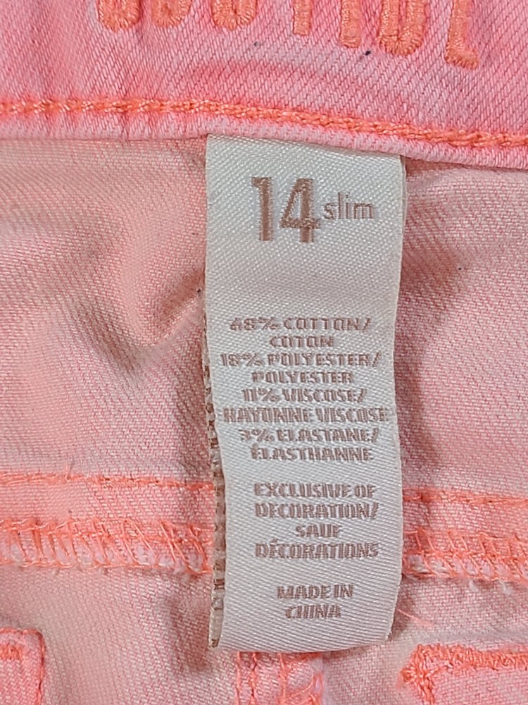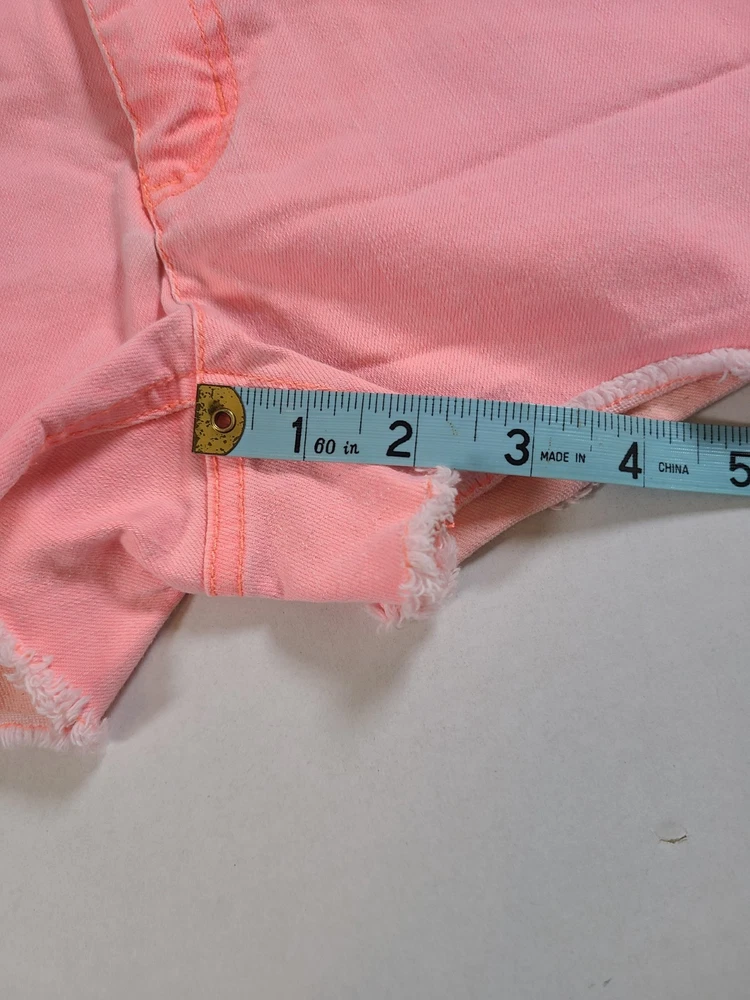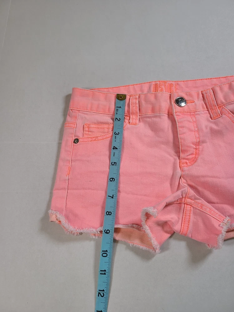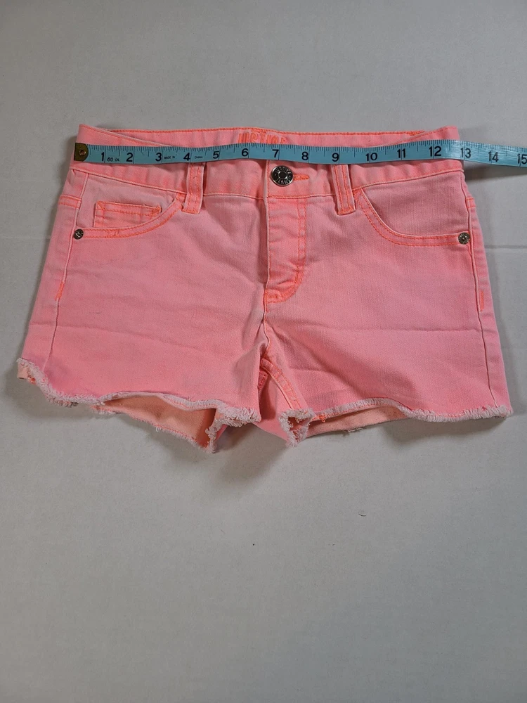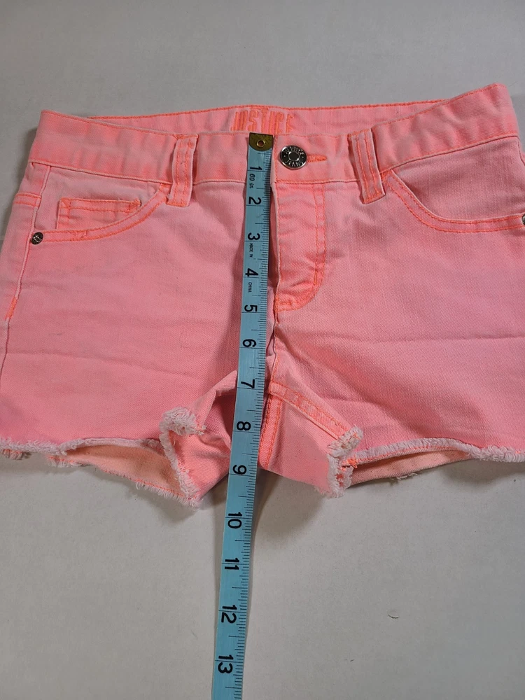 The product is a pair of cute size 14 slim fray hem shorts in light pink from the brand Justice. These denim shorts feature a solid pattern with a zip closure, making them perfect for travel, activewear, and casual occasions. With a slim fit and slimming features, these shorts are ideal for various activities such as walking, beach trips, and school. Easy to care for with machine washable fabric and suitable for all seasons, these shorts are a stylish and versatile addition to any young girl's wardrobe. Justice girls size 14 slim light pink low rise Jean Shorts. Excellent pre-owned condition. 5 pockets, a button, and a zipper, 68% cotton, 18% polyester, 11% viscose, and 3% elastane. These cute, well taken care of shorts are great for school, play, or a causal outing. See photos for measurements approximate EUC