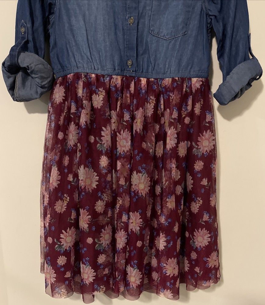 Justice, Girls, Size 12, Blue and Burgundy, Floral, Knee-Length, Dress! A2755. This is a beautiful stylish dress in excellent condition!! The material is made of cotton, lyocell, and polyester. The length from shoulder to hem is 33 inches. The lower part of the dress is layered and flowy. The sleeves are long, but can be buttoned up to 3/4 sleeves.