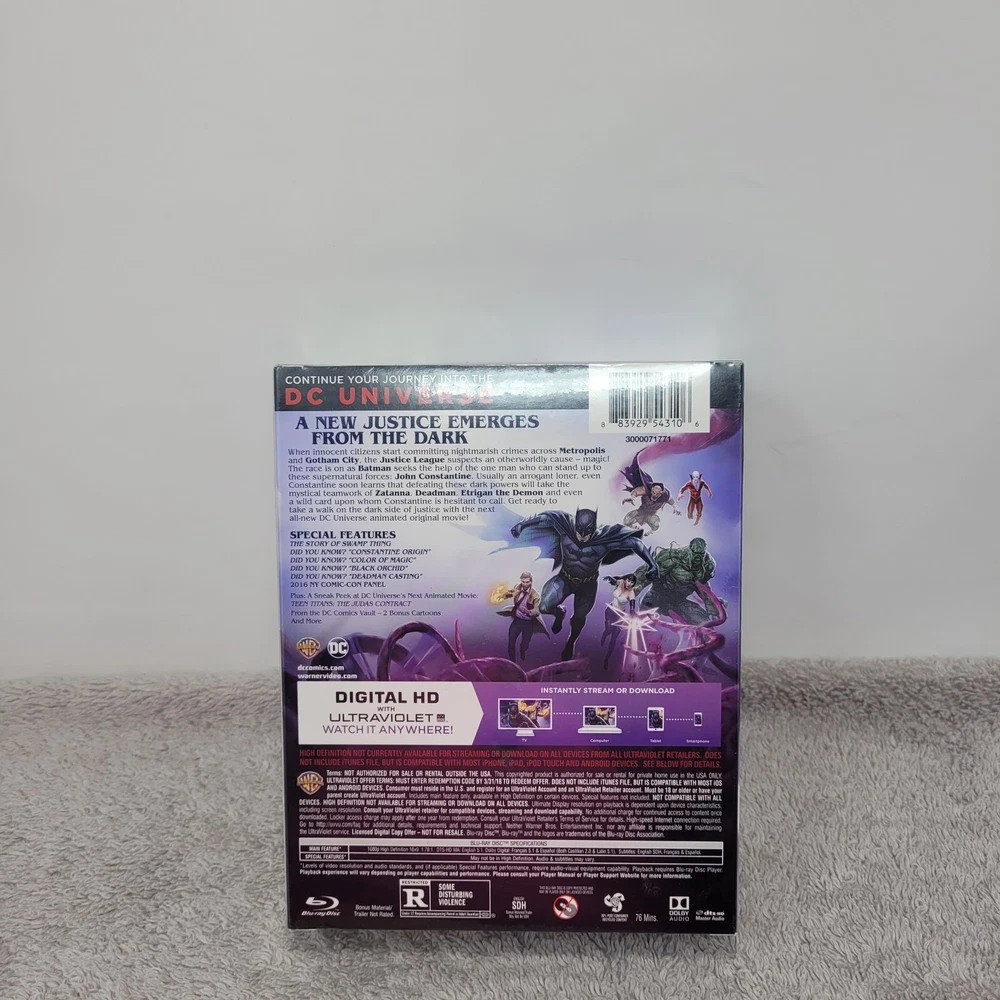 Country/Region of Manufacture:United StatesRelease Year:2017Director:Jay OlivaFormat:Blu-rayEdition:Limited EditionActor:VariousFeatures:Please See Item DescriptionSub-Genre:Superherogtin13:0883929543106Aspect Ratio:1.78:1Rating:RLanguage:EnglishType:MovieRegion Code:Blu-ray: A / DVD: 1 NTSCUPC:0883929543106Former Rental:NoMovie/TV Title:Justice League DarkStudio:Warner Home VideoGenre:Animation-Super HeroLeading Role:Various