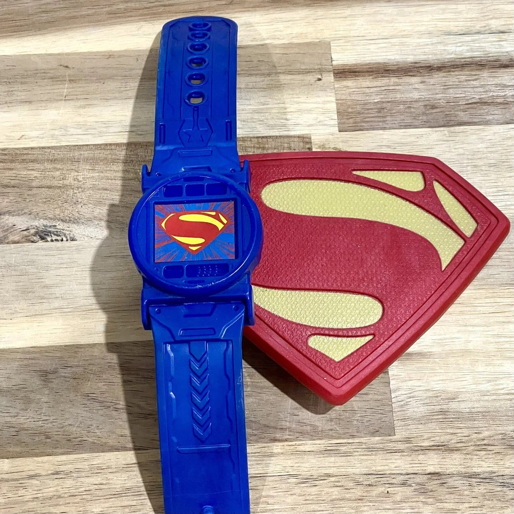 Huge lot of Superman Toys & Costume Accessories from Warner Bros. Justice League. Includes Chest armor with cape, flip up glasses, secret decoder, phone with secret compartment, wrist armor, watch with clip on Superman symbol, adjustable belt, handcuffs, spear launcher with crystal toy, & disc shooting hand blaster with 3 discs.
