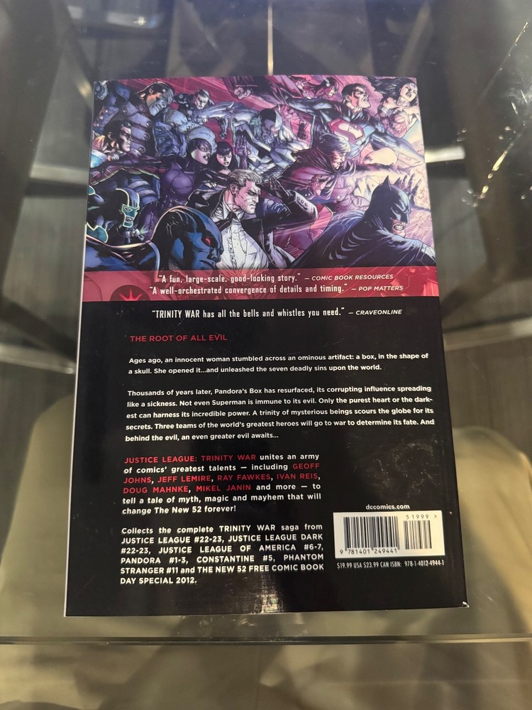 Artist/Writer:Renato Guedes, Scott Williams, Pete Pantazis, Oclair Albert, Art Lyon, Jeff Lemire, J. M. Dematteis, Daniel Sampere, Ivan Reis, Kenneth Rocafort, Patrick Zircher, Geoff Johns, Zander Cannon, Vicente Cifuentes, Rod Reis, Gene Ha, Brad Anderson, Mikel Janín, Ray Fawkes, Eber Ferreira, Jeromy Cox, Alex Sinclair, Hi-Fi, Christian Alamy, Gabe Eltaeb, Keith Champagne, Marcelo Maiolo, Blond, Walden Wong, Jim Lee, Marc Deering, Nathan Eyring, Fernando Blanco, Doug Mahnke, Tom Nguyen, Joe PradoEra:Modern Age (1992-Now)Series Title:Justice League: Trinity WarTradition:US ComicsFormat:HardcoverSuperhero Team:Justice League of AmericaPublisher:DC ComicsLanguage:EnglishPublication Year:2015Character:Justice League Dark (Black Orchid (Alba Garcia), Stargirl), Adalger (flashback), Justice League of America (Steve Trevor, Steve Trevor), Cyborg), Darla Vasquez, The Outsider (villain), Amethyst (Amy Winston, Greed (villain), Mary Vasquez, Batman (Bruce Wayne), Jason Rusch), Secret Society (villains), Atom (Rhonda Pineda), Seven Deadly Sins (Envy (villain), Frankenstein's Monster, Aquaman), Aquaman, Phantom Stranger (cameo), Justice League Dark (Deadman, Maseo Yamashiro (hallucination), Flash (Barry Allen)), Justice League Dark (John Constantine, The Question), Thomas Wayne (hallucination), Justice League (Superman, Lloyd Ortiz, Zatanna, Etta Candy, Vandal Savage (villain), MopMop (death), Dr. Fate (Khalid Ben-Hassin) (Earth-2, cameo), Zauriel, Andrew Bennett (cameo), Amanda Waller, Justice League of America (Catwoman (Selina Kyle), Green Arrow), Power Ring, Alfred, Deathstorm, Pandora (cameo), Rhonda Pineda), PANDORA, Lust (villain), Black Orchid), Green Lantern (Simon Baz), Sloth (villain), Grid, Deadman), Wonder Woman (Diana)), Deadman, Catwoman, Element Woman (Emily Sung), Justice League of America (Martian Manhunter, Stargirl (Courtney Whitmore), also as Princess Amaya) (cameo), Animal Man (Buddy Baker) (cameo), Dr. Light (Arthur Light), A.R.G.U.S. (Amanda Waller, Question, Green Arrow (Oliver Queen)), Hawkman (Carter Hall), Freddy Freeman, Stargirl, Doctor Psycho, Justice League (Aquaman (Arthur Curry), Pedro Vasquez, Stargirl (Courtney Whitmore)), Green Arrow (Oliver Queen), The Cult of the Cold Flame, Demon (Etrigan, Pride (villain)), Element Woman, Flash (Jay Garrick) (Earth-2, cameo), Justice League of America (Hawkman (Carter Hall, Ronnie Raymond), Gluttony (villain), Vibe, A.R.G.U.S. (Agent Paul Chang), Signalman (Phillip Cobb) (villain), Hawkman, Hawkgirl (Kendra Munoz-Saunders) (Earth-2, cameo), Jason Blood) (cameo), Vibe (Cisco Ramon)), Lehrer (flashback), Lex Luthor (Villain), Firestorm (Ronnie Raymond, Katar Hol), Black Adam (cameo), Shazam, Chris, Martha Wayne (hallucination), Firesorm (Ronnie Raymond, Wrath (villain)), Phantom Stranger, Sea King (death)), Madame Xanadu), Black Orchid, Justice League (Batman (Bruce Wayne), Wonder Woman (Diana Prince), Justice League of America (Green Lantern (Simon Baz), Kal-El), Crime Syndicate (Ultraman, Trinity of Sin (Pandora, Element Woman), Marcus, Lex Luthor, Martian Manhunter, Zatanna Zatara), Dr. Silas Stone, Superwoman, Justice League (Cyborg, Green Lantern (Hal Jordan) (Cameo), Mera, Constantine, Kal-El)), Circle of Eternity, Shazam (Billy Batson), Giganta (Doris Zuel) (villain), Pride (villain), Question), Steve Trevor, Mister E, Superman (Clark Kent), Flash, Madame Xanadu, Katana, Eugene Vasquez, The Question, Firestorm (Jason Rusch, Deadman (cameo), Atomica (Atom, Dr. Light (Arthur Light) (corpse), Catwoman), Marcus Severin, Plastique, Cyborg, Swamp Thing (Alex Holland) (cameo), Johnny Quick, Owlman, S.H.A.D.E. (Agent Kincaid), Darkseid (Cameo), Flash (Barry Allen)Type:Graphic NovelGenre:Superheroes, Fantasy, Horror & Sci-Fi or SuspenseCover Artist:Scott Williams, Jim Lee, Alex Sinclair