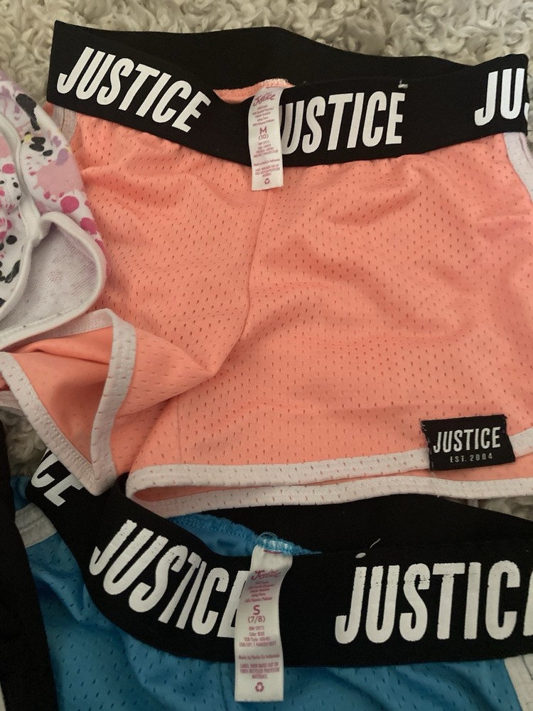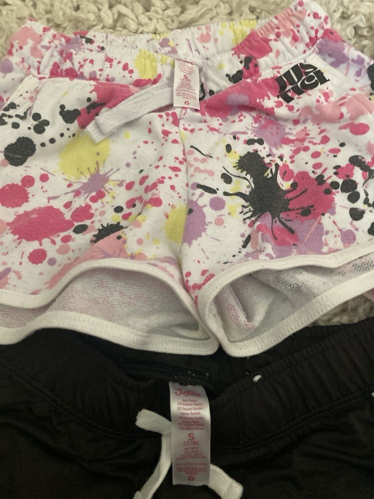 The product is a lot of 4 short shorts for girls in size 7/8 from the brand Justice. The black shorts are size 10. The shorts come in a multicolor design, making them versatile for different outfits. This style of shorts is perfect for warm weather and can be paired with different tops for a stylish look. Made for young girls who love trendy and comfortable clothing, these shorts are a great addition to any wardrobe.