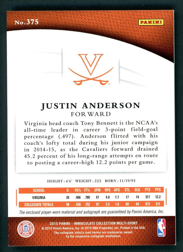 This card is in good condition with some wear to the edges/corners (see pictures). This card includes a three-color piece of memorabilia, is hand signed by Justin Anderson, and is serial numbered 61/99! -------------------------- 1. Payment is due within 2 days of purchase. 2. Payment by PayPal E-Check will have to wait until it has cleared before shipping. This can take 5-7 for PayPal E-Check. 3. Please make any shipping requests prior to purchase. I will do my best to accommodate any shipping instructions. -------------------------- 1. Please view the shipping and payments tab for shipping rates. 2. I will combine shipping on multiple item purchases! 3. Please make any shipping requests prior to purchase. I will do my best to accommodate any shipping instructions. -------------------------- All items are sold AS-IS in the description and as pictured. Stock photos are never used, only REAL photos! If you have any questions or concerns, please ask them before purchasing. All questions are answered as quickly as possible! Please read the listing carefully.