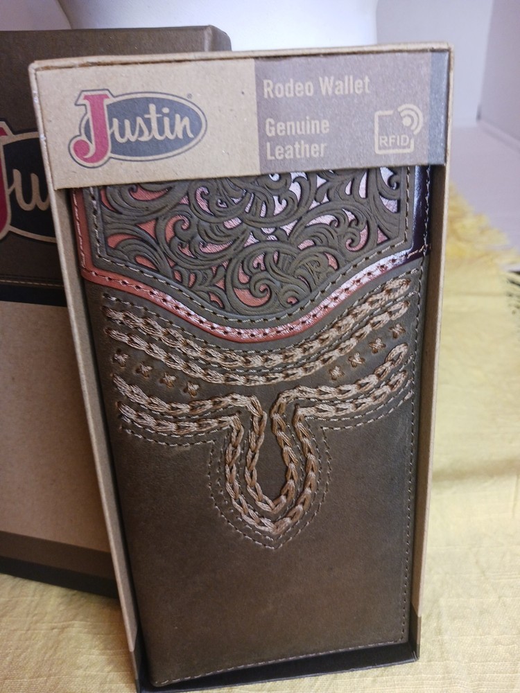 The Justin Boots Mens RFID Rodeo Wallet in Brown Leather is a stylish and functional accessory for men who appreciate a western theme. Made from high-quality leather with decorative accents, this bifold wallet features RFID blocking technology to protect your credit cards and personal information. The wallet's design includes multiple compartments for organizing your cards and cash, making it easy to keep your essentials secure and accessible. Perfect for those who love the rodeo or cowboy lifestyle, this wallet combines practicality with a touch of Western flair.