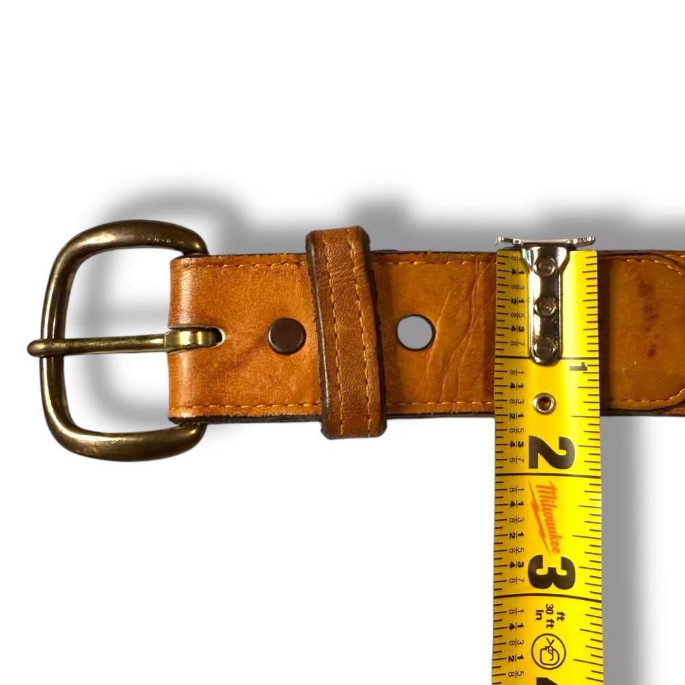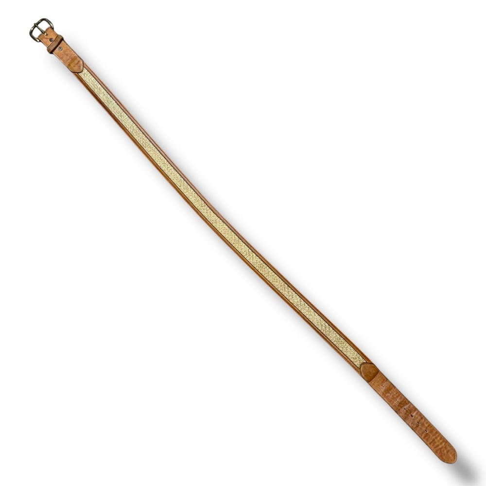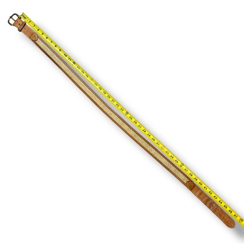 Justin Boots Western Belt Mens Tan Leather and Leather and Woven Straw Size 44 This Justin Boots Western Belt combines the classic look of tan leather with a unique woven straw design, creating a stylish and versatile accessory for any western outfit. Made from quality materials for durability and comfort, it’s the perfect choice for daily wear. The belt is in good used condition and ready to wear. There is some scuffs on the belt leather. Size - 44