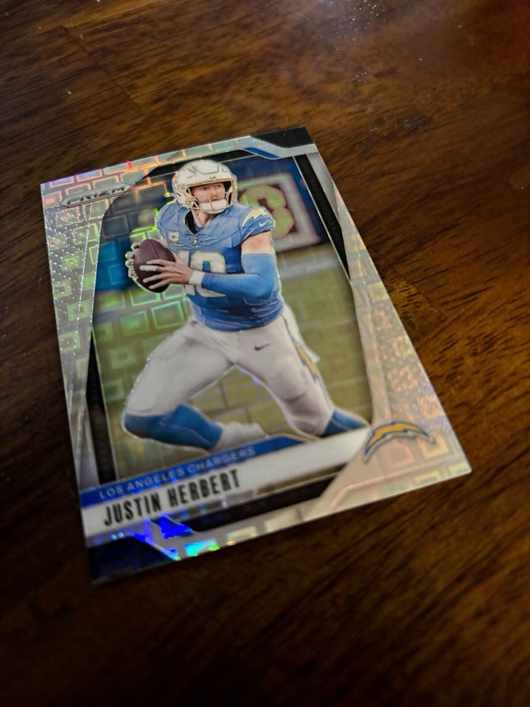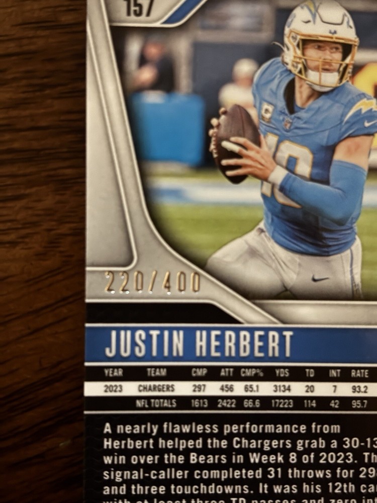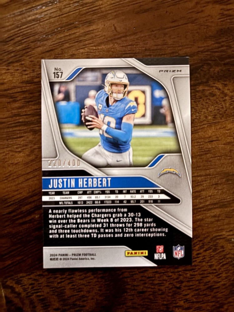 Player/Athlete:Justin HerbertPrint Run:400Team:Los Angeles ChargersLeague:National Football League (NFL)Manufacturer:PaniniCard Number:157Season:2024Type:Sports Trading CardSet:2024 Panini PrizmFeatures:Exclusive, Parallel/Variety, Serial Numbered, Short PrintParallel/Variety:Pandora PrizmSport:Football