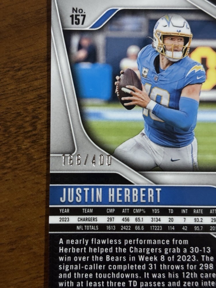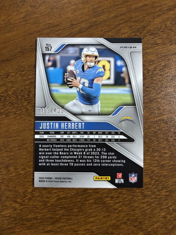 Type:Sports Trading CardFeatures:Exclusive, Parallel/Variety, Serial Numbered, Short PrintPrint Run:400Sport:FootballCard Number:157Team:Los Angeles ChargersManufacturer:PaniniSeason:2024Parallel/Variety:Pandora PrizmLeague:National Football League (NFL)Player/Athlete:Justin HerbertSet:2024 Panini Prizm