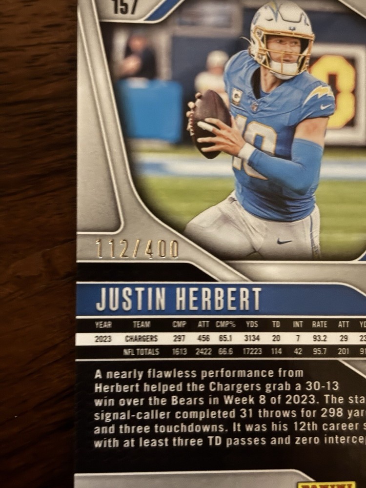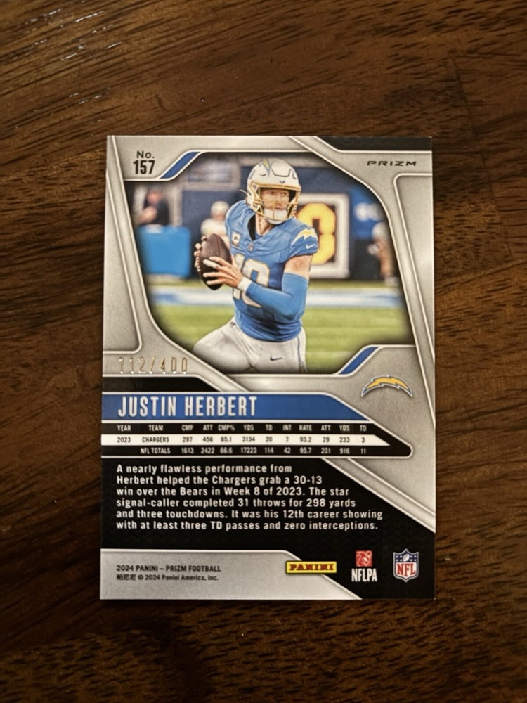 Team:Los Angeles ChargersFeatures:Exclusive, Parallel/Variety, Serial Numbered, Short PrintPrint Run:400League:National Football League (NFL)Season:2024Type:Sports Trading CardPlayer/Athlete:Justin HerbertSet:2024 Panini PrizmManufacturer:PaniniSport:FootballParallel/Variety:Pandora PrizmCard Number:157