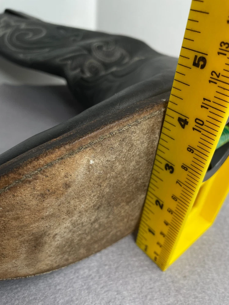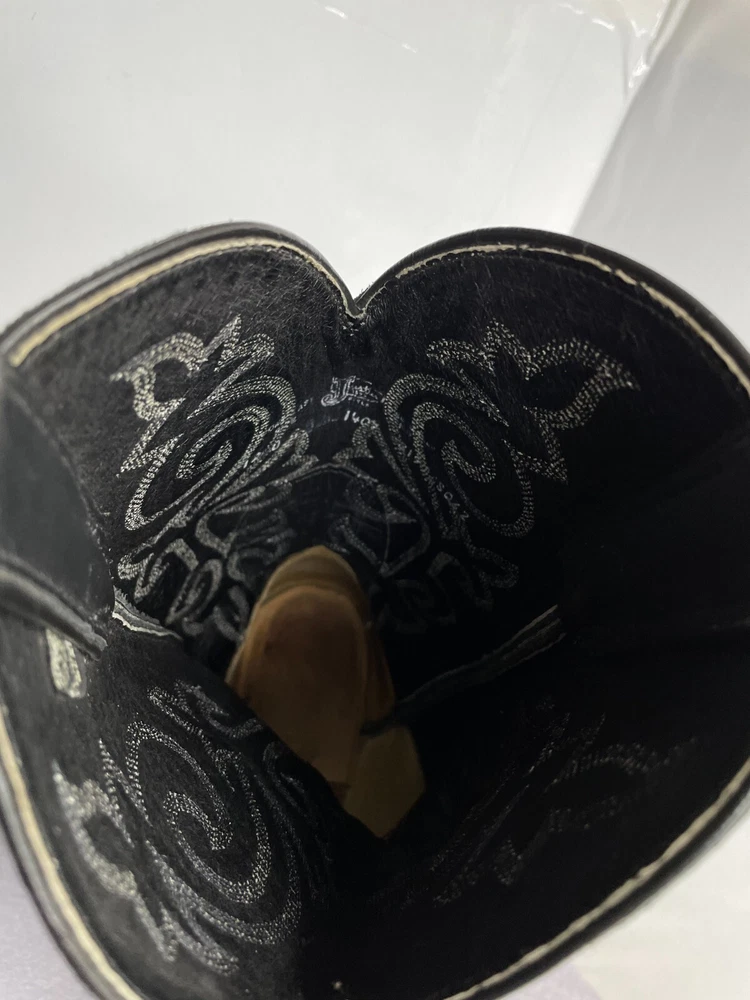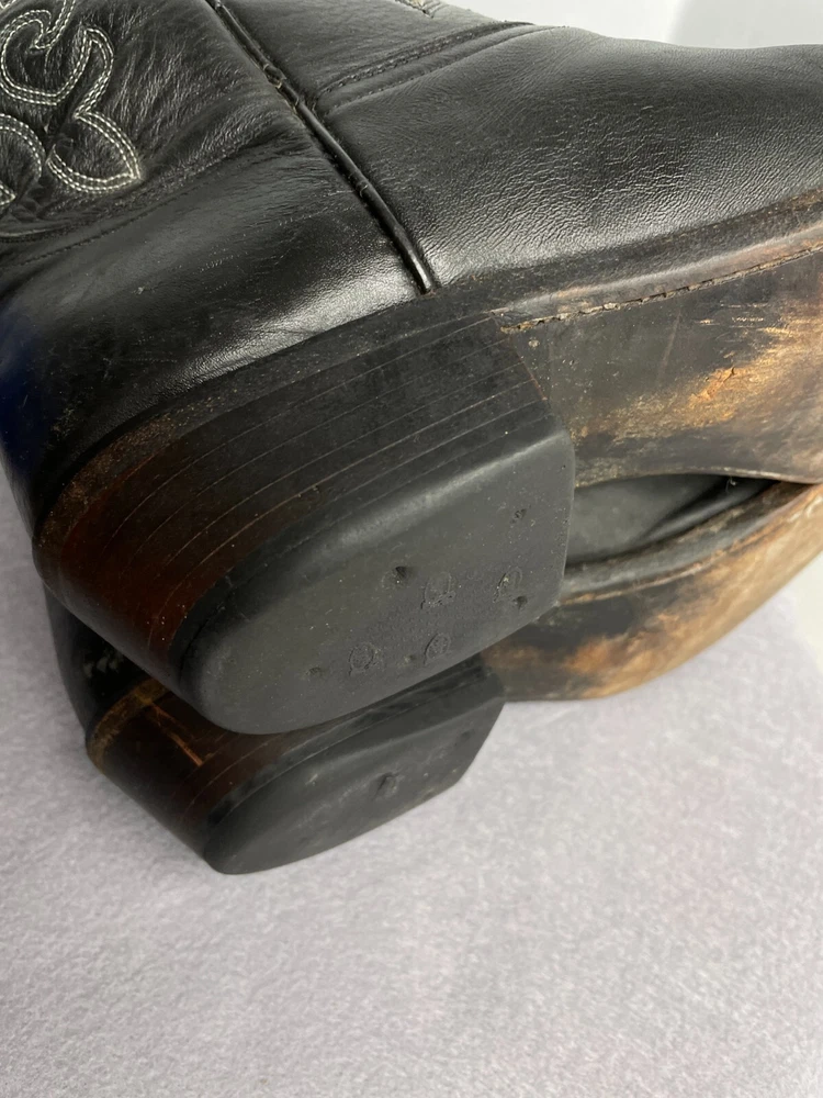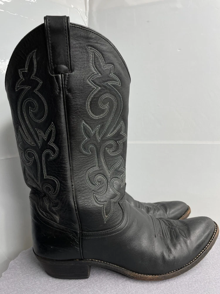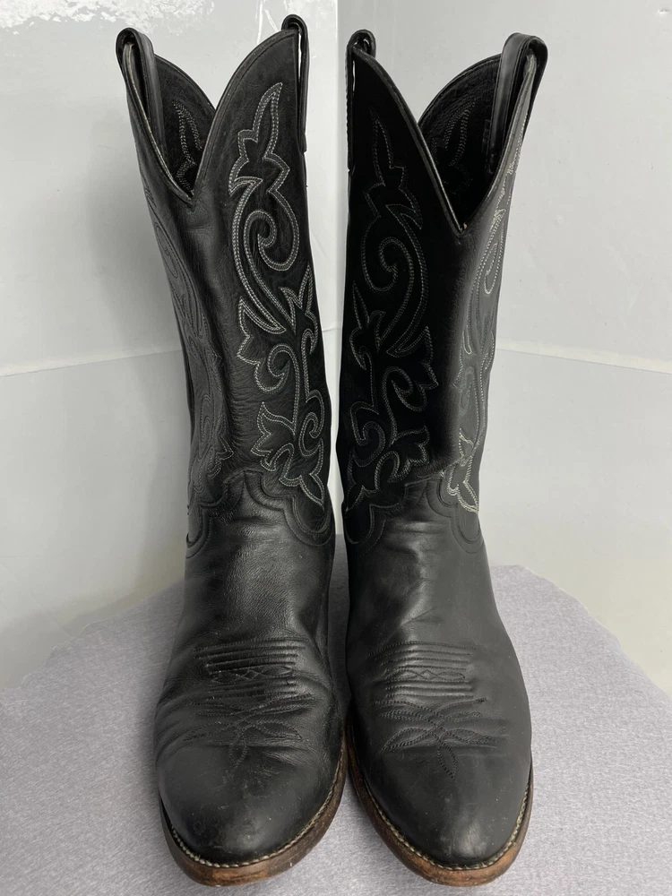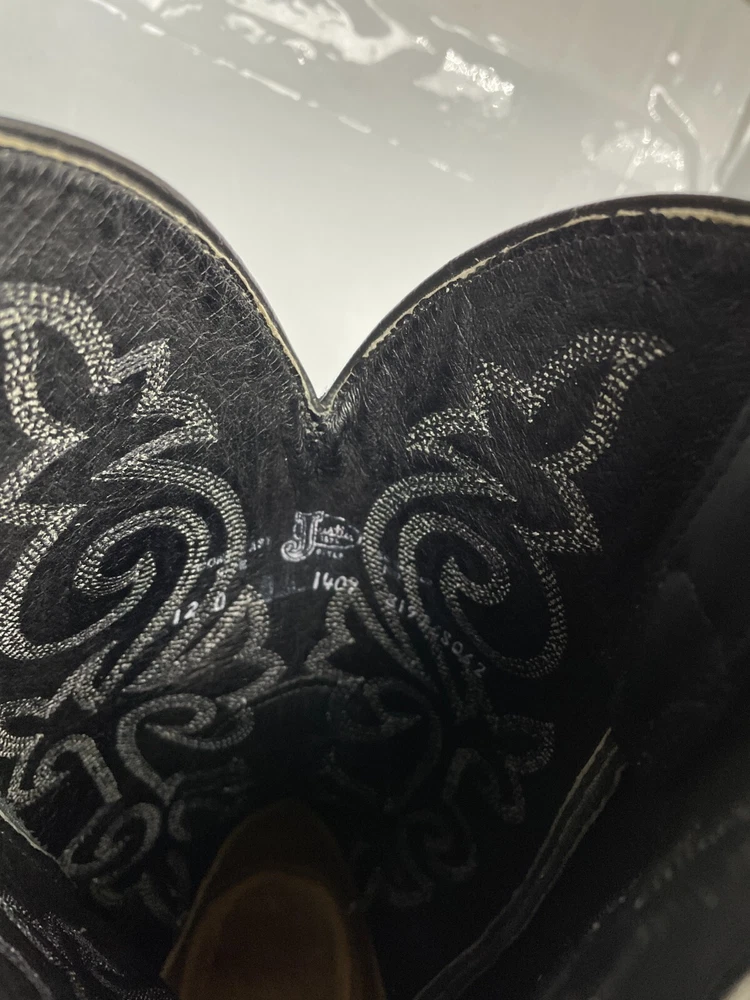 US Shoe Size: 12 Closure: Pull On Product Line: Justin Boots Shoe Width: Standard Features: Comfort Model: 1409 Color: Black Pattern: Western Upper Material: Leather Theme: Biker, Cowboy, Western Accents: Embroidered Department: Men Style: Western Brand: Justin Boots Type: Boot Toe Shape: Almond Toe