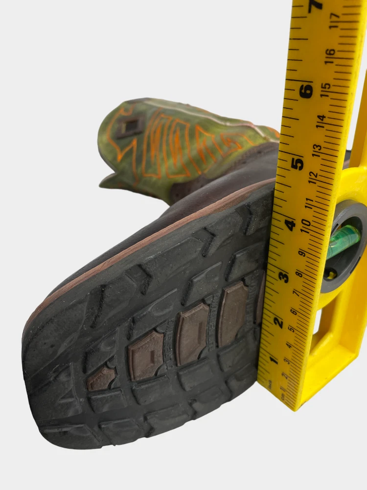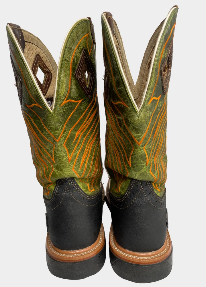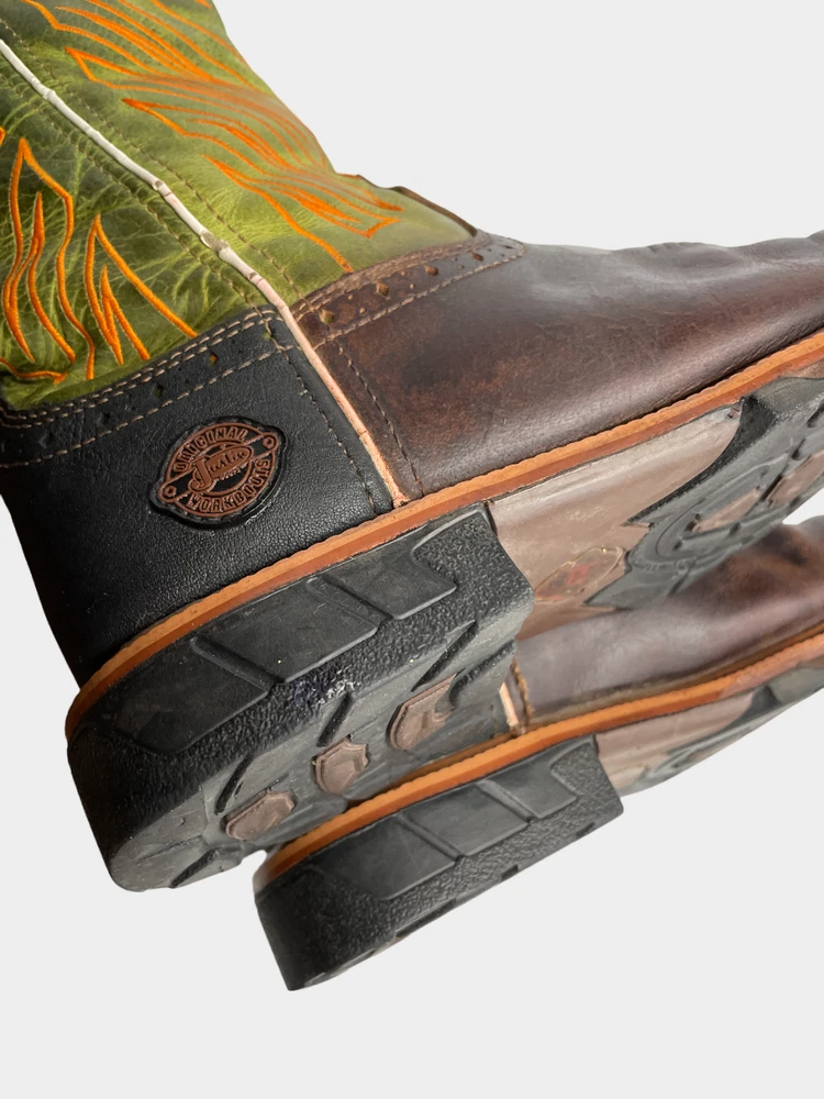 Department: Men Theme: Biker, Cowboy, Motorcycle, Work Brand: Justin Boots Color: Green Style: Western Upper Material: Leather Model: WK4970 Pattern: Western US Shoe Size: 8 Toe Shape: Square Toe Closure: Pull On Accents: Embroidered Product Line: Justin Workboots Shoe Width: EE Type: Boot Features: Comfort