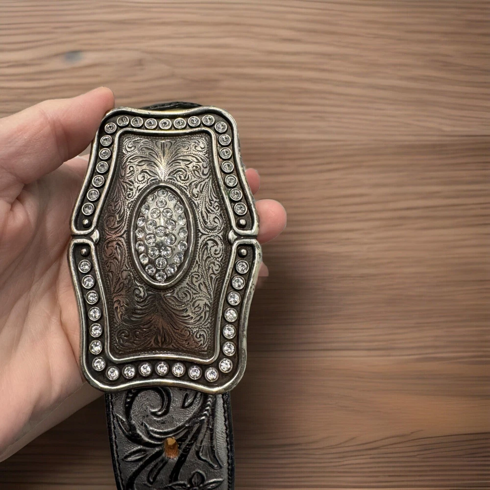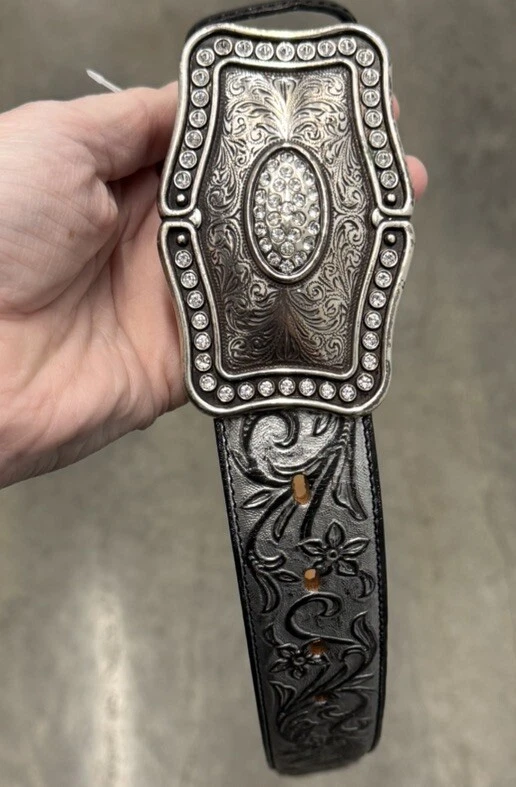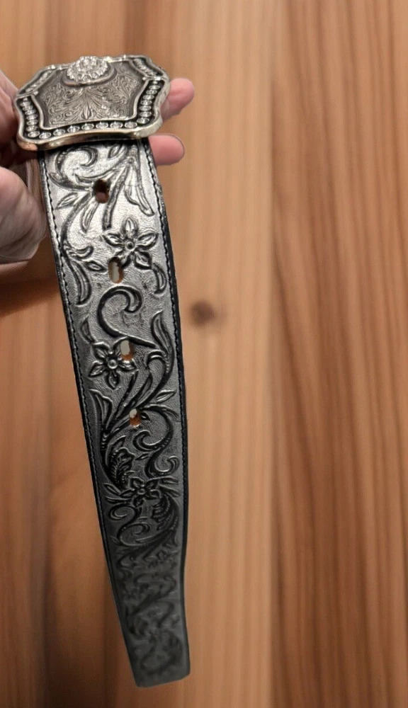 This Justin Western belt is a must-have for any cowgirl or rockabilly enthusiast. The belt features a beautiful silver brocade design and is made of high-quality leather. The belt is accented with a stunning jeweled buckle that adds a touch of glamour to any outfit. The belt is a size 38 and is perfect for women who want to add a touch of Western style to their wardrobe. The belt is perfect for pairing with a pair of jeans or a skirt and is sure to make a statement. The belt is also a great gift for any Western or cowboy enthusiast.