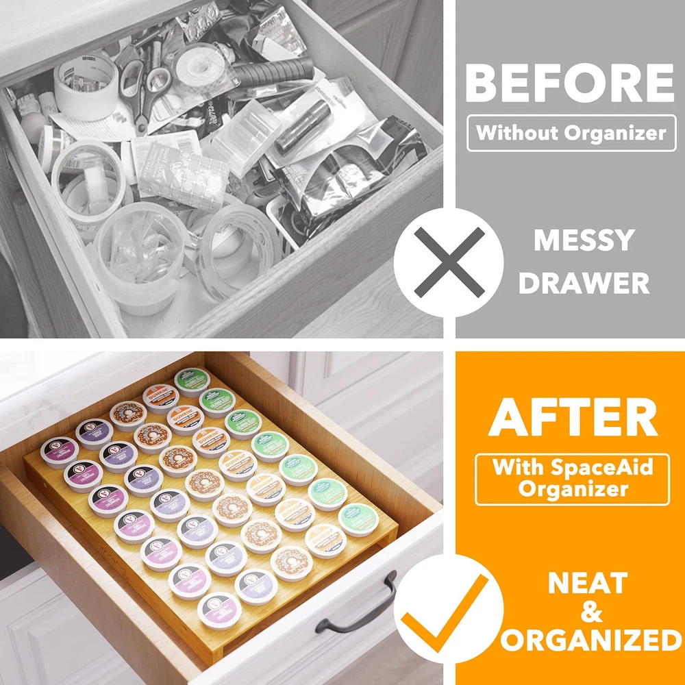 K Cup Drawer Organizer Insert, Kitchen K Cups Coffee Pod Holder Tray Organizers for Kcup Coffee Station Drawer Storage Organization (35 Slots) ORGANIZED AND BEAUTIFUL - Make your kitchen drawer organized with k cup organizer; The k-cup pods organizer is designed for your drawer organization; SIZE: 15.3"L x 11.5"W x 1.6"H HOLD 35 K-CUP COFFEE PODS - This k cup holder is designed wih 35 slots for k cup coffee pod drawers; with coffee pods KITCHEN K CUPS STORAGE - Designed to hold k cups; The pod organizer for kitchen storage organization is 1.6" High; MEASURE YOUR DRAWER HEIGHT FIRST STURDY CONSTRUCTION - Made of durable solid ; Sturdy enough to hold kcup coffee pods; Live an organized and sustainable life with this drawer organizer for k cups EASY TO ASSEMBLE - It is super easy to put the k-cup holder together; You will get clear instructions and all the hardware needed (even the screwdriver!) in your package; USPTO Patent Pending