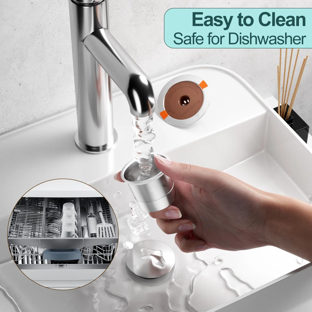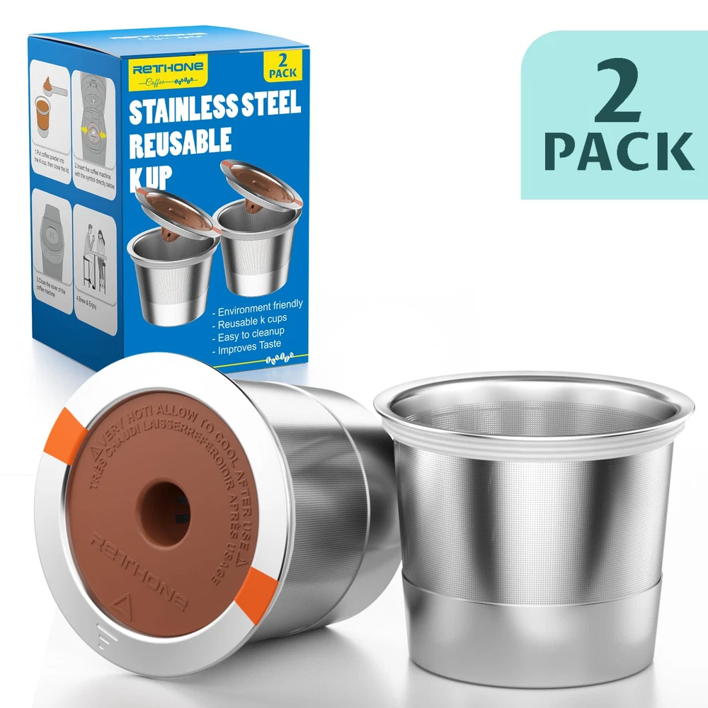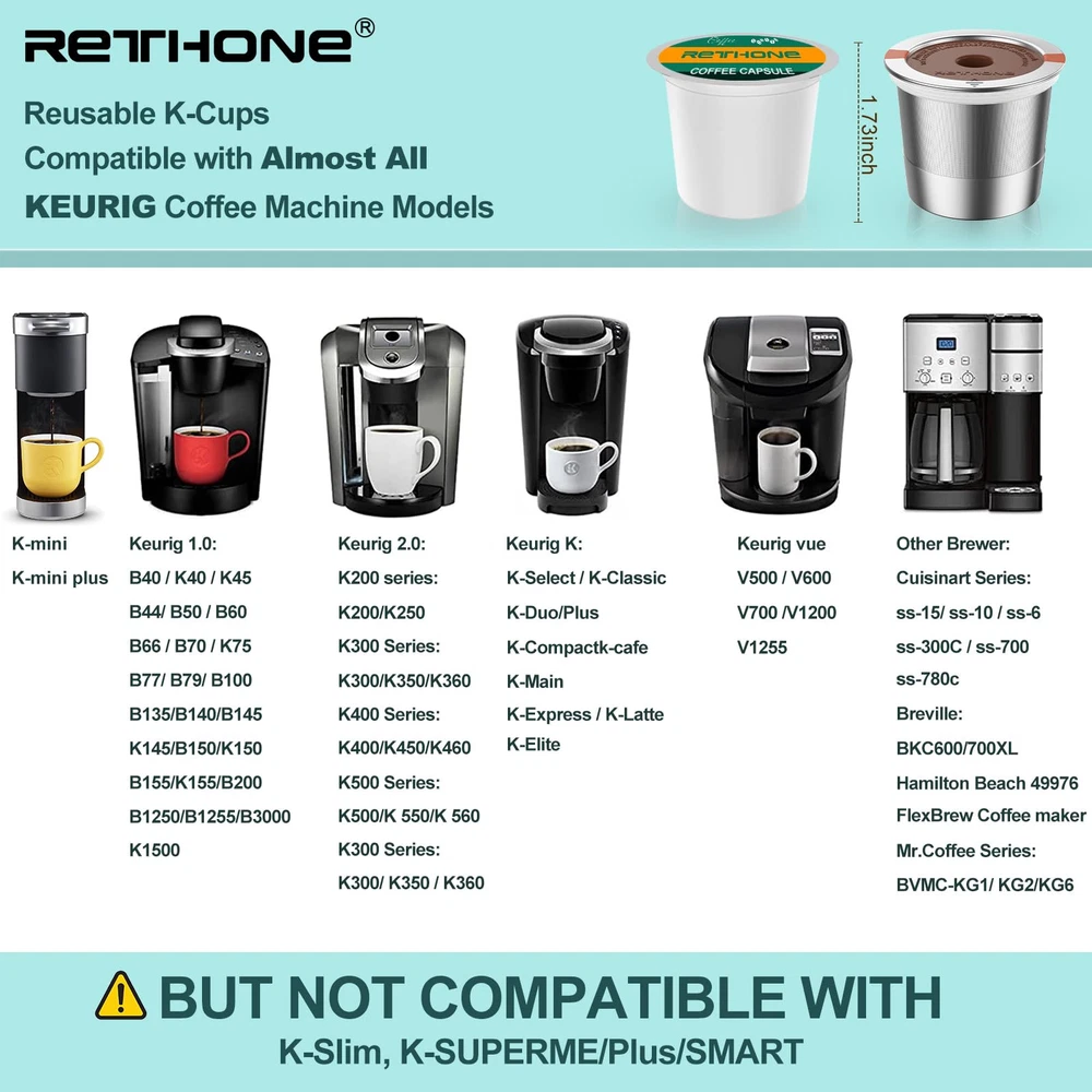 Perfect K Cup Reusable Filter: The reusable K cups are compatible with Keurig 1.0 and 2.0 coffee machines, and also work with Keurig K-Classic, K-Elite, K-Latte, K-Cafe, K-Select, K-Compact, and Breville K CUP, Mr. Coffee K CUP, But NOT Compatible with: Keurig K-Supreme/Plus/Smart, K-Slim (See full detailed list picture) Great Seal& Fresh Taste: These reusable coffee pods with unique embedded sealing rings, and bottom and sides with dense mesh to allow coffee to flow out and keep grounds in. Eco-Friendly& Money Saver: reusable K cups are the same size as the K pods, They are stainless steel much cheaper overall, last forever, and Eco-Friendly. Easy to Use & Clean: These refillable k cups are easy to clean, tap against the trash then rinse under the tap. Perfect Sealing: K cup reusable coffee pods are designed with one-piece construction and a solid top seal. The rubber rings for the top seal with a notch that matches it perfectly which ensures it is leakage-free.