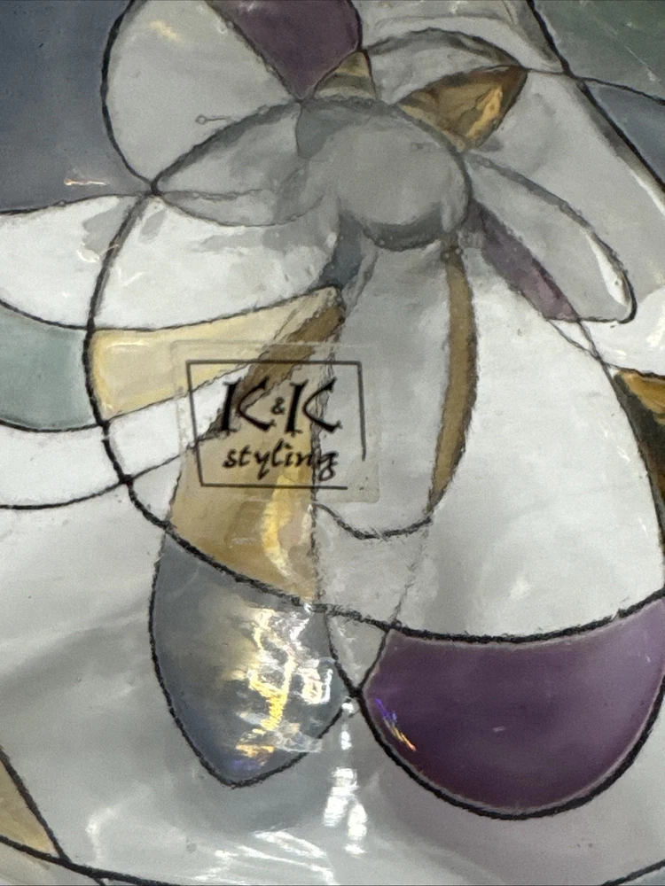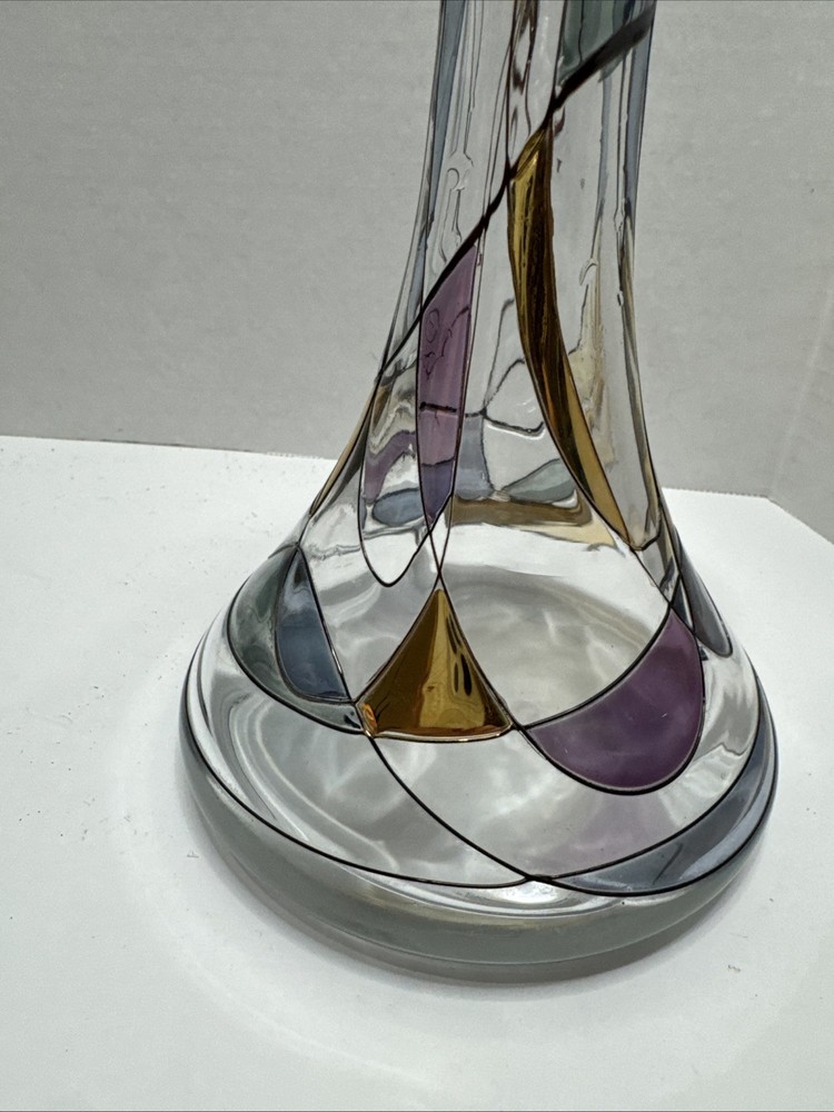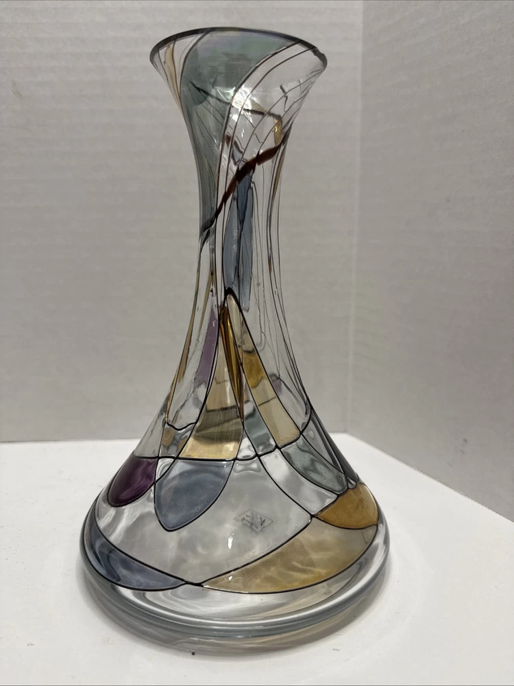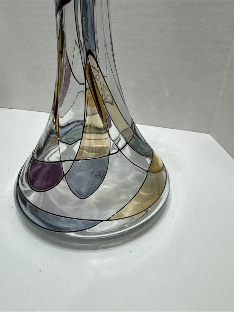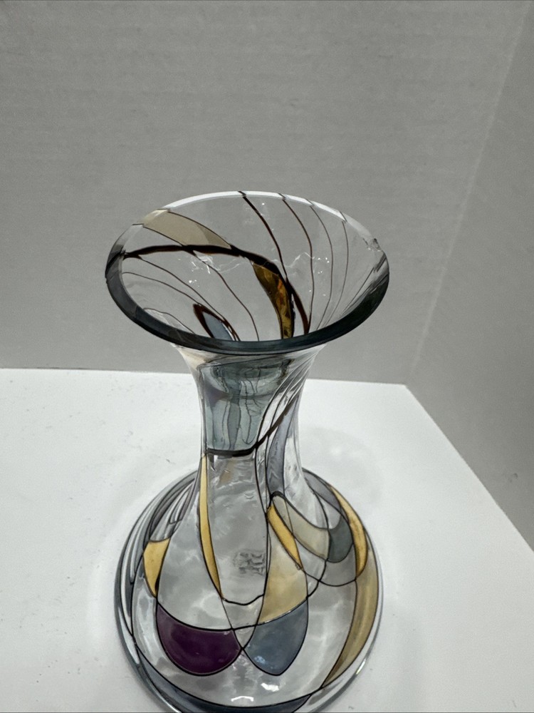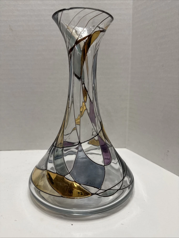 This unique 8" art vase is a stunning piece of handcrafted glassware from Germany. The multicolored, abstract pattern swirls around the tulip-shaped vase, making it a perfect addition to any room. The vase is made using traditional glassmaking techniques, and features engraved decorations that add to its Pop Art style. Care instructions are included, and the vase should be cleaned with a damp cloth. This vintage piece is perfect for teens and adults, and is a great addition to any home decor. The K & K Styling Pop Art Vase is a one-of-a-kind item, and is sure to be a conversation starter. Small tiny chip in rim. See all photos.