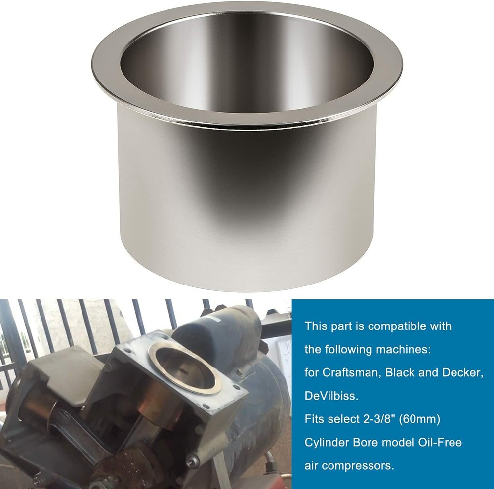 Fitment: Compatible with both the single cylinder oil-free pumps and the twin cylinder oil-free pump, fits for DeVilbiss, for Porter Cable, for Sears Craftsman, for Snap On, for Ex-Cell, for Air America, for Charge Air Pro, for Grainger, for Stanley Black, for Decker and many other privately labeled air compressors. Fits model number 165080. Features: 1) When your compressor runs so loud or does not build pressure, please use this compressor ring kit to fix it, our high quality ring kit will fix the problem and make the compressor working like a new one 2) Extremely easy to install the kit, just take the cylinder system apart, the new sleeve has a rolled bottom so you need to remove the piston from the shaft and slide it up over piston, put the ring on piston before inserting into sleeve will be easier. 3) Made of high class quality steel and rubber, the cylinder sleeve is hardened to ensure tough and high pressure withstand, and it’s rustproof and corrosion resistance. The piston ring and sleeve O-rings are made of specific rubber, they will seal the cylinder and provide a great airtightness to ensure minimum loss of gases. They are very durable that could serve for many years. Installation Guide Step 1. Uninstall the parts as direction: fill pipe-top cylinder head- valve plate assembly-cylinder sleeve- belower fan- piston rod. Step 2. Install the piston ring on the piston rod. Step 3. Insert the piston rod into the sleeve. Step 4. Attach the piston on the shaft and tight the screw. Step 5. Replace the both sleeve o rings on the valve plate assembly, then cover to the piston back. Step 6. Torque the cylinder head on and install the other parts back as direction. Package included: 1 x D25837 Coated Cylinder Sleeve 1 x DAC-308 Coated Oil Free Piston Ring 1 x SSF-3158-1 Piston Rod Cap Screw 1 x SSG-8156 Valve Plate to Cylinder Sleeve O-Ring 1 x ACG-45 Cylinder head to Valve Plate O-Ring