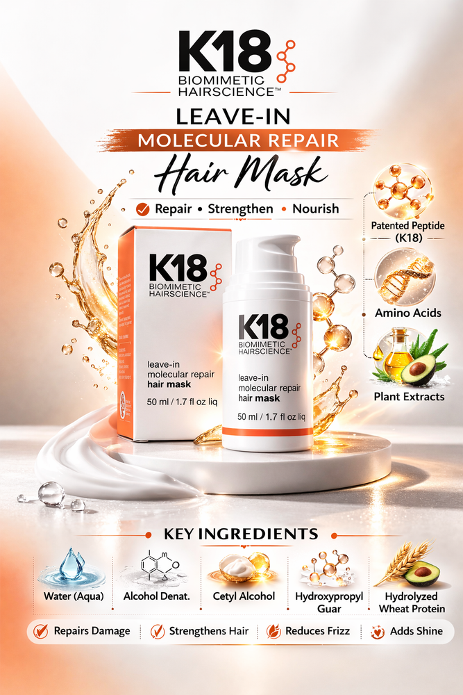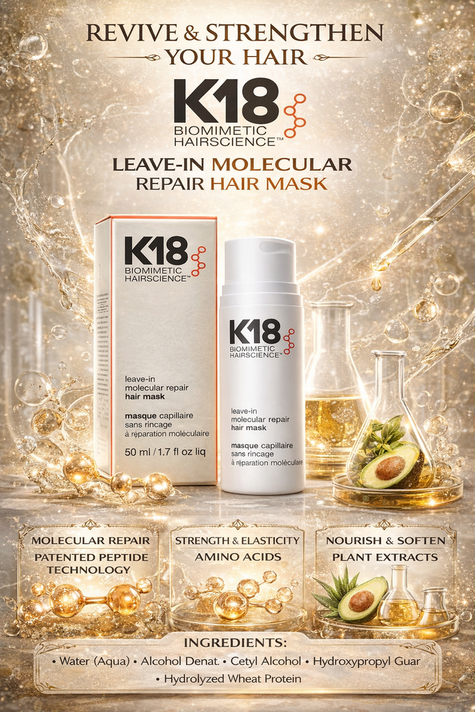 K18 Leave-In Molecular Repair Hair Mask 50ml / 1.7oz Professional Biomimetic Hairscience Treatment ✔ Brand New ✔ Authentic ✔ Salon-Grade Formula Revolutionary Molecular Hair Repair K18 Leave-In Molecular Repair Hair Mask is a breakthrough biotech treatment powered by patented K18Peptide™ technology. Designed to reverse damage from bleach, color, heat styling, and chemical services, this leave-in formula works at the molecular level to restore hair’s strength, softness, and elasticity. Unlike traditional conditioners that only coat the hair surface, K18 penetrates deep into the cortex to reconnect broken keratin chains. In just 4 minutes, hair feels smoother, stronger, and visibly healthier without weighing it down. Perfect for all hair types including straight, wavy, curly, coily, fine, thick, chemically treated, and color-damaged hair. Key Benefits Molecular Repair: Reconnects broken keratin chains Damage Reversal: Repairs bleach, color & heat damage Stronger Hair: Improves elasticity & resilience Frizz Control: Smooth, shiny, manageable finish Weightless Formula: No heavy residue Professional Results: Salon-quality performance How To Use Shampoo hair (do not condition). Towel dry thoroughly. Apply 1–3 pumps depending on hair length and thickness. Wait 4 minutes to activate. Do NOT rinse. Style as usual. Product Specifications ✔ Brand: K18 Hair ✔ Product: Leave-In Molecular Repair Hair Mask ✔ Size: 50ml / 1.7oz ✔ Type: Leave-In Treatment ✔ Suitable For: All Hair Types ✔ Condition: Brand New ✔ Authenticity: 100% Genuine Product K18 hair mask 50ml, K18 leave in repair treatment, molecular hair repair mask, K18 peptide hair treatment, salon professional damage repair, K18 biomimetic hairscience authentic.