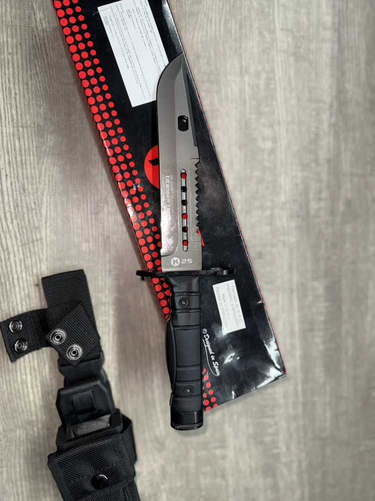 This is a K25 tactical fixed blade knife with a 7" stainless steel clip point blade. The handle is made of black rubber for a secure grip. It has a full tang construction and comes with a sheath. This versatile knife is suitable for hunting, combat, and survival purposes. Made in China, it features a plain edge and a gray blade color. The part number is RUI32067.