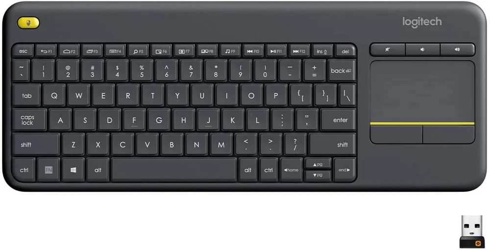 Media-Friendly: The K400 Plus wireless touch TV keyboard gives you integrated, comfortable control of your PC-to-TV entertainment, eliminating the clutter of a separate keyboard and mouse Plug-and-Play: Simply plug the Unifying receiver into a USB port and the wireless touchpad keyboard is ready to go; adjust controls using the Logitech Options Software to save preferred settings Power-Packed: Built with laid-back control in mind, this wireless TV keyboard has a reliable and long battery life of up to 18 months (2), including an on/off button to help it go even longer Wireless Freedom: Designed for seamless comfort and control, this HTPC keyboard boasts a range of up to 33 ft (1) wireless connectivity, with quiet keys and a large touchpad for easy navigation Broad Compatibility: Designed for use with Windows 7, Windows 8, Windows 10 and later, Android 7 or later, and Chrome OS Durable and Reliable: The spill-resistant design (4) and long-lasting keys keep you on-track despite any mishaps Upgrade to Logitech K830 Keyboard: For increased comfort, illuminated keys, USB/Bluetooth connectivity and a rechargeable battery try the K830 wireless keyboard. Touchpad Height: 2.99 in (76 mm), Width: 1.85 in (47 mm) Product carbon footprint: 4.9 kg CO2e Certified carbon neutral In case of wireless keyboard or combo (keyboard and mouse), the USB receiver is usually provided either inside the mouse (under the battery cover) or attached within the product packaging The Logitech Wireless Touch Keyboard K400 Plus lets you experience PC-to-TV entertainment the way you Watch video, browse the web, chat with friends and much more. The all-in-one keyboard with touchpad ends the hassle—and clutter—of multiple devices. And a 10-meter (33-foot) wireless range ensures your fun won’t be interrupted. Comfortable, quiet keys and a large (3.5-inch) touchpad make navigating entertainment effortless. Even setup is a snap thanks to the tiny, plug-and-play Unifying receiver. The 18-month battery life means you might even forget the keyboard needs batteries. 1 Wireless range may vary depending on operating environment and computer setup. Assumes up to two hours typing per day. Actual battery life will vary with use, settings and environmental conditions.