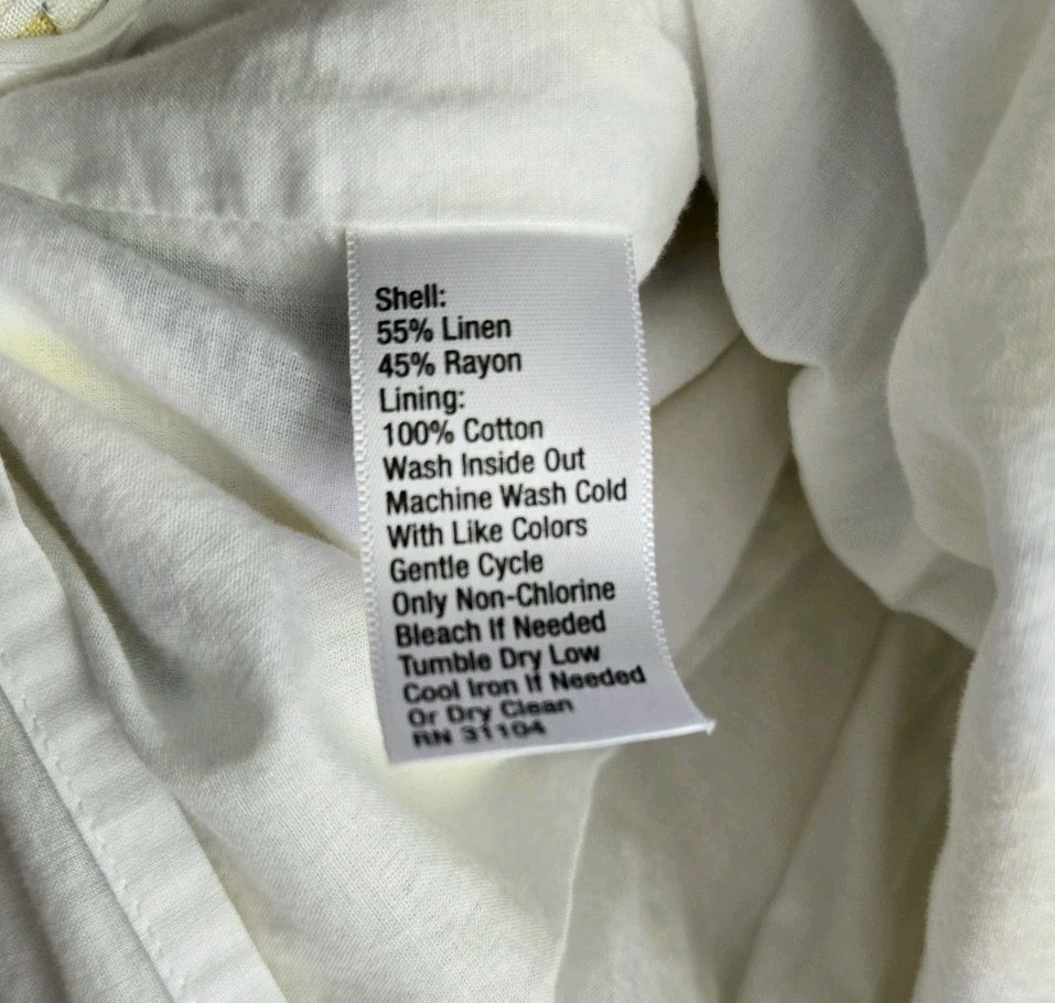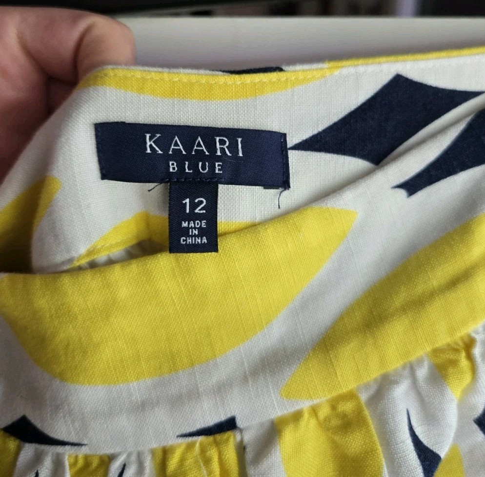 This KAARI BLUE skirt is a vibrant and stylish addition to any wardrobe. The bold yellow and white pattern with navy blue accents makes a statement, while the gathered waist creates a flattering silhouette. Made from a comfortable linen and rayon blend, this size 12 skirt is perfect for warm weather. The 100% cotton lining adds a touch of luxury. Stylish skirt Yellow & white Size 12 Linen blend Comfortable fit MEASURMENTS in inches Waist: 32 Length: 19 Comes from a smoke free home. All clothing is in excellent condition unless otherwise stated. ----------------------------------------------------- BIN C