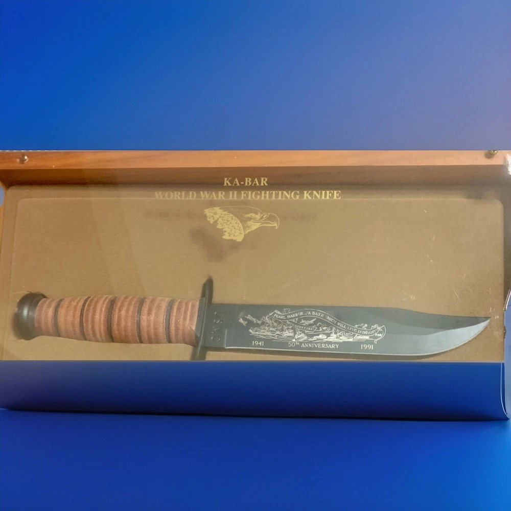 This KA-BAR 50th Anniversary Pearl Harbor commemorative knife is a must-have for collectors and enthusiasts. With a black drop point blade and a handle designed with the Ka-Bar Club logo, this combat knife is a beautiful piece of history from the United States. The blade is in excellent condition and ready for display or use. Don't miss out on the opportunity to own this piece of American heritage.