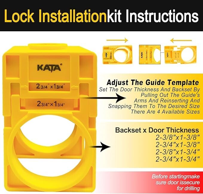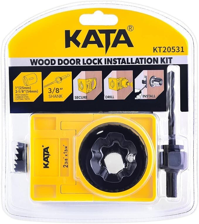 Install door locks with precision and ease using the KATA Door Lock Installation Kit, designed for wooden doors ranging from 1-3/8" to 1-3/4" thick. This complete set includes a durable carbon steel hole saw and a convenient guide template to help you accurately align and drill holes for door locksets and deadbolts. Features: Fits Standard Door Sizes: Compatible with doors 1-3/8" to 1-3/4" thick. Precision Guide Template: Ensures accurate alignment for proper lock placement. Durable Hole Saw: Made of high-quality carbon steel for clean and smooth cuts. Easy to Use: Ideal for both DIYers and professionals. Versatile Application: Suitable for wooden interior and exterior doors.