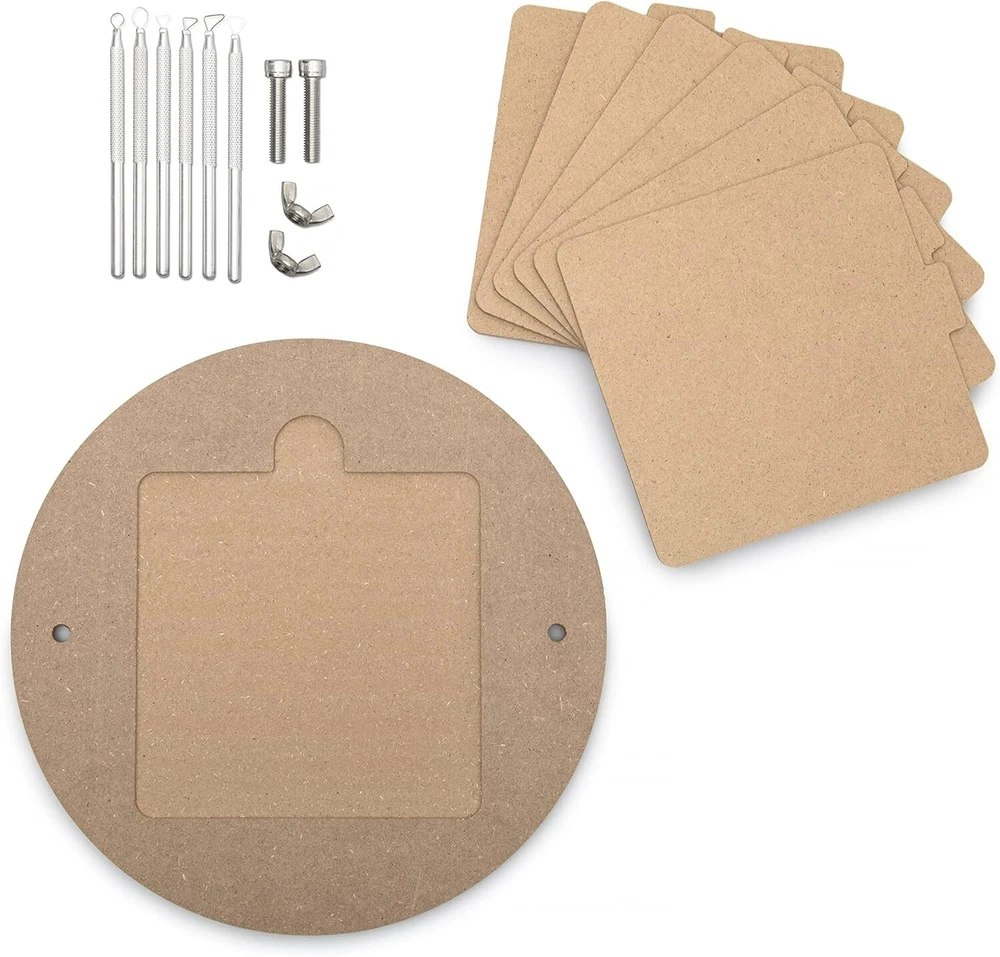 Product Description: KATAI Pottery Bat Set with Sculpting Tool Kit and Bat Pins Pottery Wheel Bats Pottery wheel bats are extremely convenient tools to have in a ceramics studio. They are flat discs that attach to a pottery wheel head and are available in a variety of sizes and shapes. They are made from a variety of different materials such as; plastic, wood and plaster. Typically pottery heads have two holes that fit snugly onto a pair of bat pins that are inserted into your wheel head. Once it is attached to the wheel head, then you can work directly on the bat. You can then lift it off your wheel head, with the thrown pot, without disrupting your work. Easy to Use By drying your pots on your square inserts you are saving precious space in your studio. To use your bat system simply lift the inner bats from the insert tab in the outer bat by using your fingers or a flat potter's tool. Heavy Duty Materials Your pottery wheel bats help protect your work and your valuable equipment. The bat and the pot can be easily removed from the potter's wheel head so there is no need to directly handle your creations. Your inserts are made out of durable masonite and the outer bat is made from a very strong and water/warp-resistant exterior grade wood material. Do not leave your outer bat or inserts sitting in water. Just gently clean and dry. Sculpting Tool Kit and Bat Pins Included in this deal is a durable and easy-to-clean 6 piece aluminium sculpting tool kit. This lightweight kit works well on various modelling materials including clay and wax. Also included is a pair of bat pins that work on most brand wheels. What is Included? 1 x Round Outer Bat 6 x Square Inner Bats 6 x Sculpting Tool Kit 2 x Bat Pins Your space saving bat system for a potter's wheel has a bat adapter with removable inserts. This bat set fits standard wheel heads. The pin holes are spaced 10" apart on center. Your pottery bat insert system is made from premium moisture-resistant wood. Included in this offer is a 6-piece aluminium sculpting tool kit 9 (12 cm - 13 cm) and a set of bat pins (1 1/4" long). Your KATAI pottery bat set comes with a 12 inch round outer bat and a set of six 7 inch square inner bats.