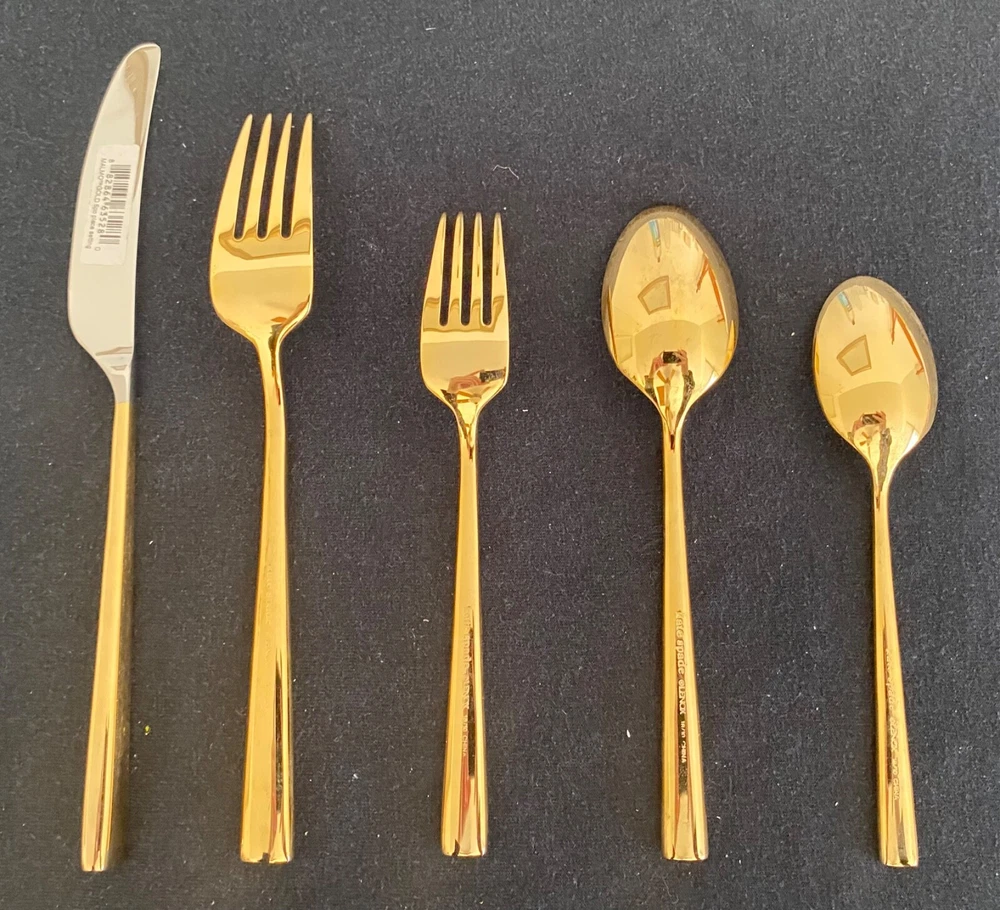 KATE SPADE LENOX Malmo Gold 5-Piece Place Setting~18/10 Stainless Steel *Brand: Kate Spade/Lenox *Pattern: Malmo *18/10 Stainless Steel *Gold color *5 Piece Set *Includes: 2 spoons, 2 forks, 1 knife *NEW and Open Box; box may show some shelf wear.
