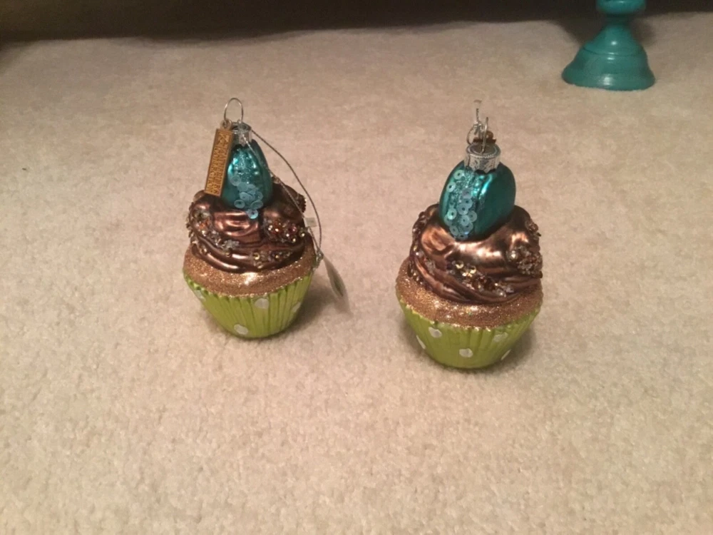 YOU ARE GETTING 2 OF KATHERINES GORGEOUS GINGERBREAD CUPCAKES. THEY ARE ABOUT 4IN Hgh. SO DETAILED WITH ALL THE SEQUINS, GLITTER AND BEADING ON THESE 3 TIERED CUPCAKES WITH GLITTERED CHOCOLATE AND THEN SEQUIN AND BEADED CHOCOLAE ON THE MIDDLE LAYER AND THEN WHAT LOOKS LIKE A MACAROON ON TOP OF THESE DETAILED HAND BLOWN ORNAMENTS. ADDITIONAL SHIPPING TO ALASKA OR HAWAII. PLEASE SEE MY LISTINGS FOR OTHER UNIQUE ITEMS AND MORE ORNAMENTS. YOU ARE GETTING 2 OF THESE THIS IS ABOUT HALF OF WHAT THE COST WOULD BE FOR KATHERINES COLLECTIONS.