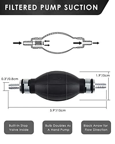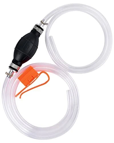 Return Policy Fast Delivery Trusted seller KATUMO Gasoline Siphon Hose, Gas Oil Water Fuel Transfer Siphon Pump, Portable Widely Use Hand Fuel Pump, Fuel Transfer Pump with PVC Hoses Product Description Premium Quality Rubber: The pump bulb is made of high quality rubber, thick and sturdy, build-in stop valve prevent backflow of the fluid for siphoning liquid flow quicker and faster. With 2 flexible PVC transparent hoses for visual liquid flow progress, high temperature and corrosion resistant, can be used for a long time. (The two hoses are in diferent size. The longer hose or the shorter hose can be placed at the source container or the container based on your use condition) Clip and Retainer Use: The two metal clips are for fixing the hoses in place with the pump bulb, prevent slippage or leakage. And an adjustable hose retainer is for keeping the hose standing into the container or receiver, avoid slipping out and permit one hand-free operation. Easy and Safe Siphon Pump: Say Good-bye to the dangerous and inefficient mouth suction way. Just connect the hoses to the pumb bulb, the black arrow towards the fluid following direction, put the upper hose into the source tank, a few squeezes of the bulb will get the fluid started following, then put the lower hose into the receiver tank, the fluid will flow automatically (The source fluid must be higher 11 inch or more than the receiver). Efficient Manual Siphon Pump: Hand siphon hose pump for gasoline, oil, water, diesel and other common liquids, ideal for emergency transfer. Also suits for fish tank, aquarium tank, small fountain and small air cushion swim pool water transfer. NOT for edible oil, drink water, salt water and any chemical liquids. Multi-Use Manual Transfer Pump: Lightweight hand siphon fuel pump is enough for simple daily use, suits for medium and small type equipments without anti-theft filter net, such as brush cutter, lawn mover, hedge trimmer, snow blower, motorcycle, scooter, ATV, lawn tractor etc, NOT for big truck types. Shipping Returns Payment Shipping Shipping is FREE to all addresses other than APO/PO boxes in the lower 48 states. All our stock ships from US-based warehouses. Shipped via USPS or UPS (depending on location and package weight) Unless stated otherwise, all orders will ship within 24-72 hours of your payment being processed. Check our feedback to see the great reviews of FAST shipping we offer. Returns Seller does not accept returns Payment We currently accept payment via eBay managed payments only. Once payment is cleared, we will dispatch your shipment within 1-3 business days. Please refer to the "Shipping" tab for more information regarding shipping speed to your destination.