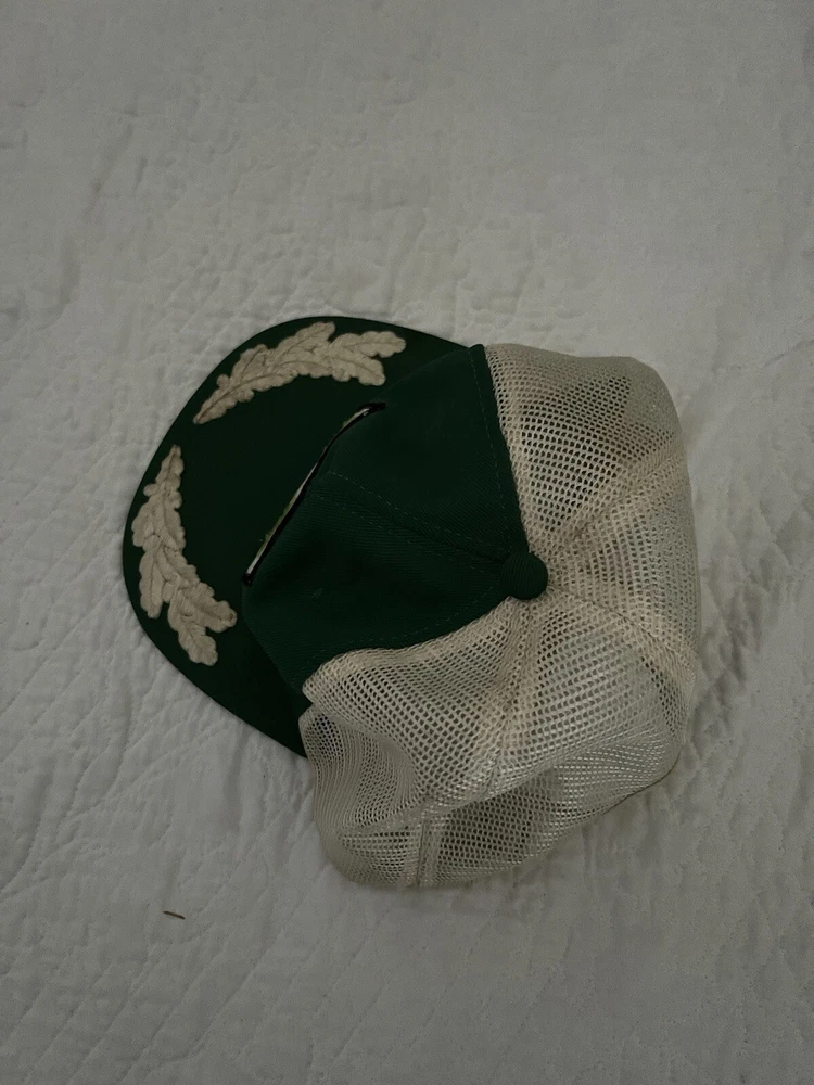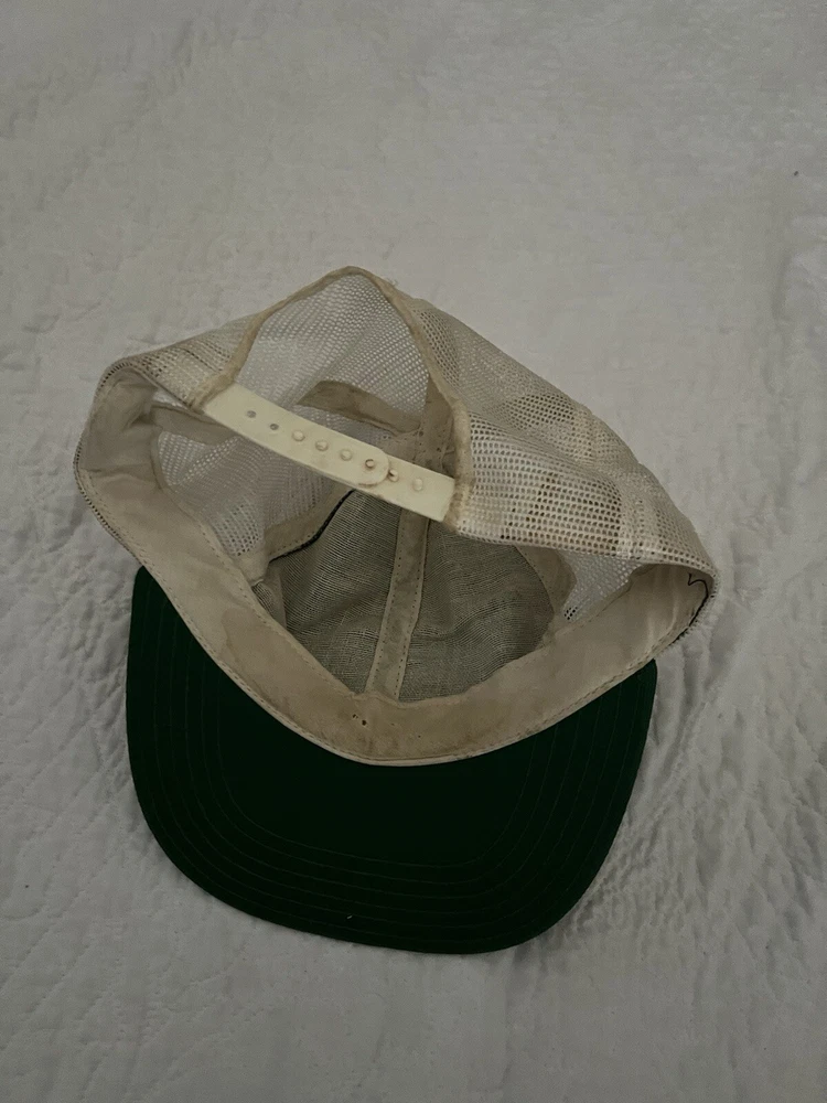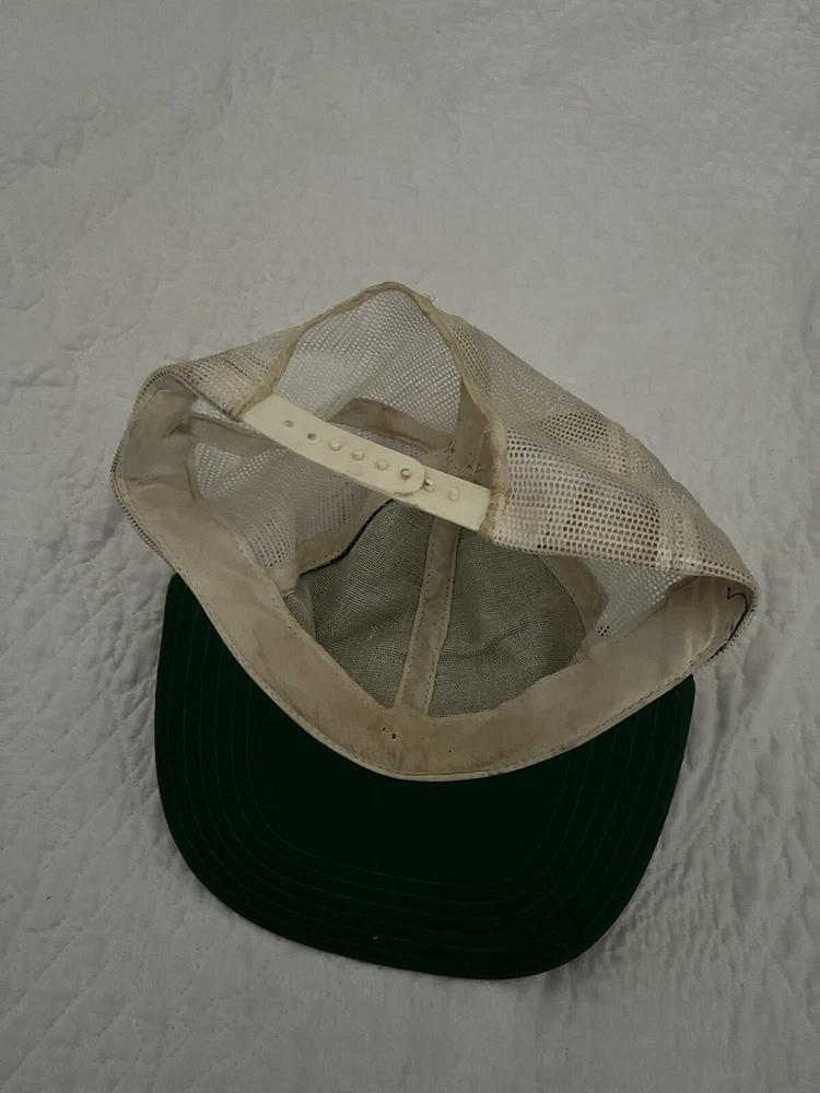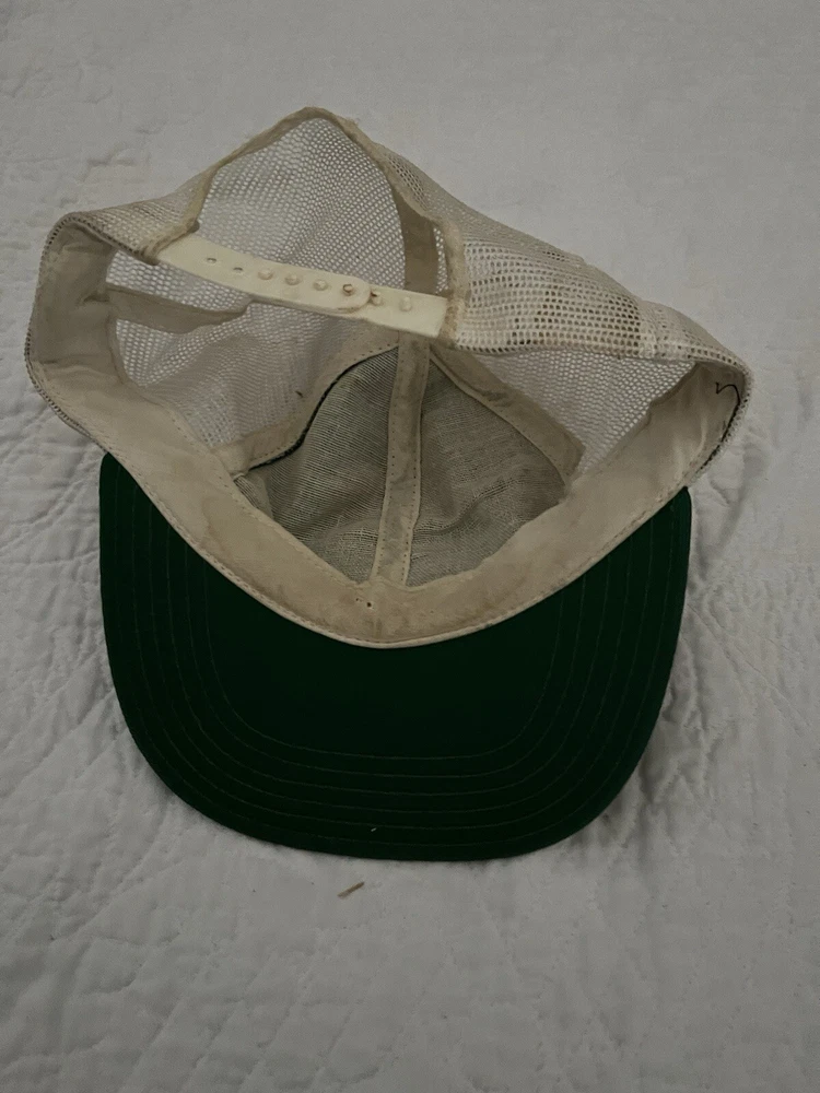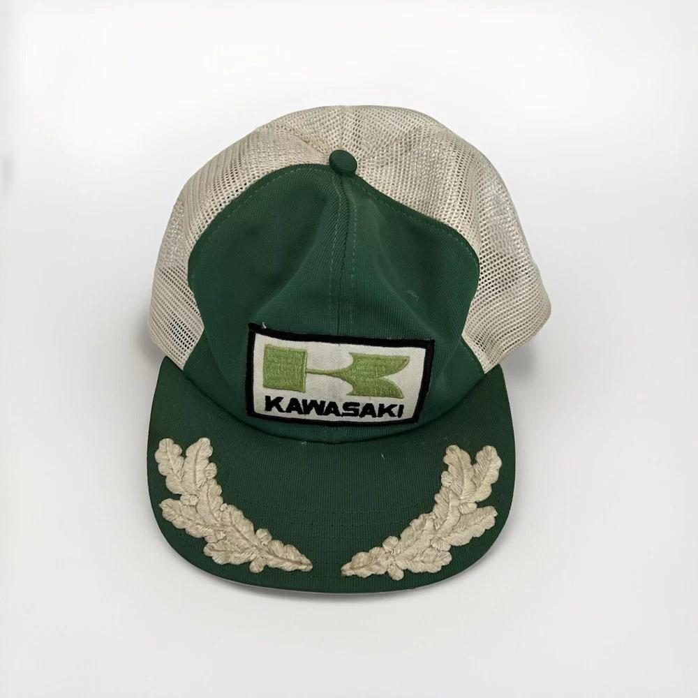 Fair used condition signs of wear all throughout really cool retro look captain hat embroidery This vintage 80s Kawasaki Motorcycles mesh trucker hat is a stylish and classic accessory for men. The hat features a solid green color and a retro snapback design, perfect for casual occasions and fans of motorcycle culture. Made of polyester with a mesh back for breathability, this one-size-fits-all hat is adjustable for a comfortable fit. The nostalgic design and Kawasaki branding make it a standout piece for those who appreciate a touch of 80s style.
