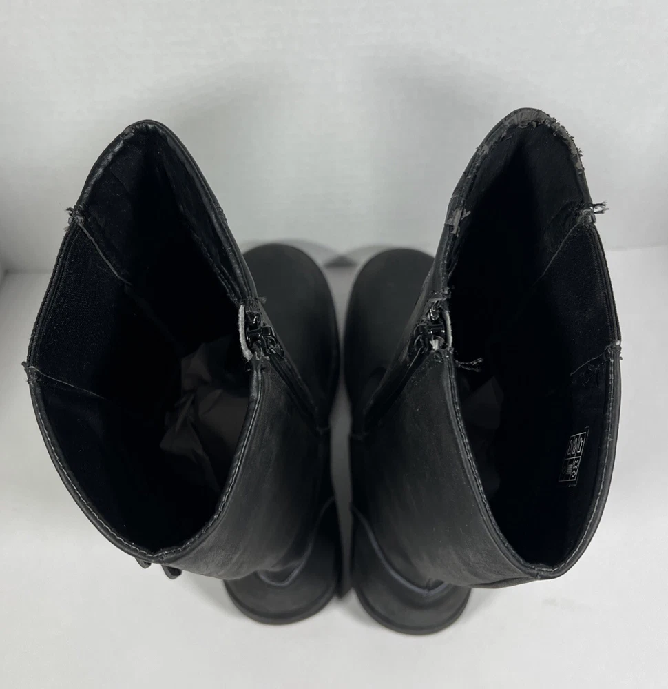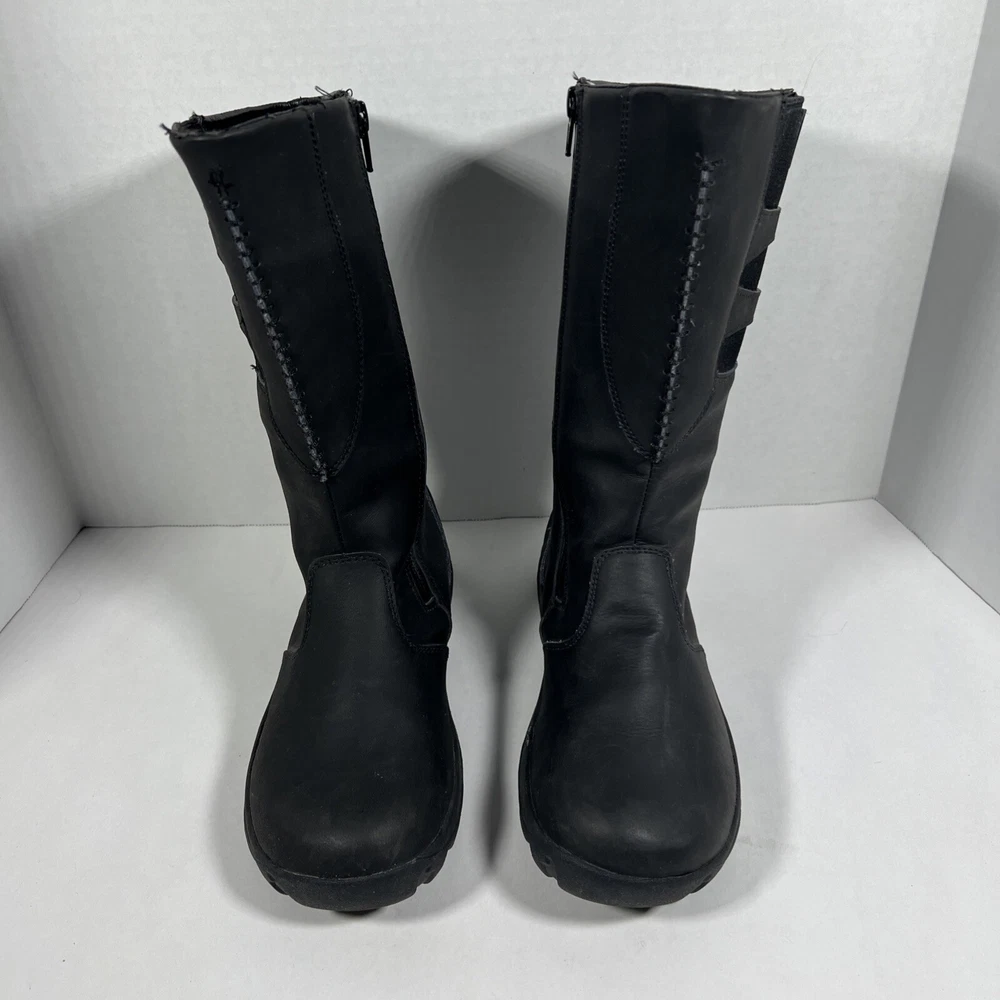 *Please review all photos closely before purchasing due to boots having signs of use and wear with some faint scuffs and marks to rubber sidewalls and leather exterior and right boot having some material loss on inner upper portion of front boot leather edge from being preowned to prevent return.* Elevate your winter style with these KEEN Bern Baby Bern boots. Made of black leather, these knee-high riding boots feature a buckle accent and logo detail. The boot has a side zip closure and standard shoe width, making it easy to put on and take off. Perfect for the colder months, these boots have a solid pattern and are suitable for women's US shoe size 5 and UK shoe size 4. The calf width is regular, ensuring a comfortable fit. These boots are a great addition to your winter wardrobe, providing both style and practicality. Zip Up Boots Keen Durable Original Classic Iconic Winter Wear Waterproof Leather Boots Travel Business Work Snow Dry Warm