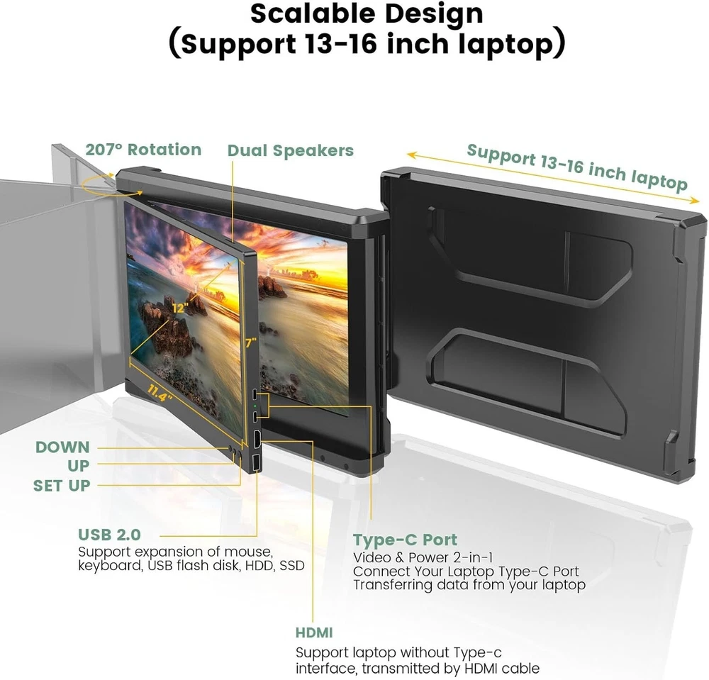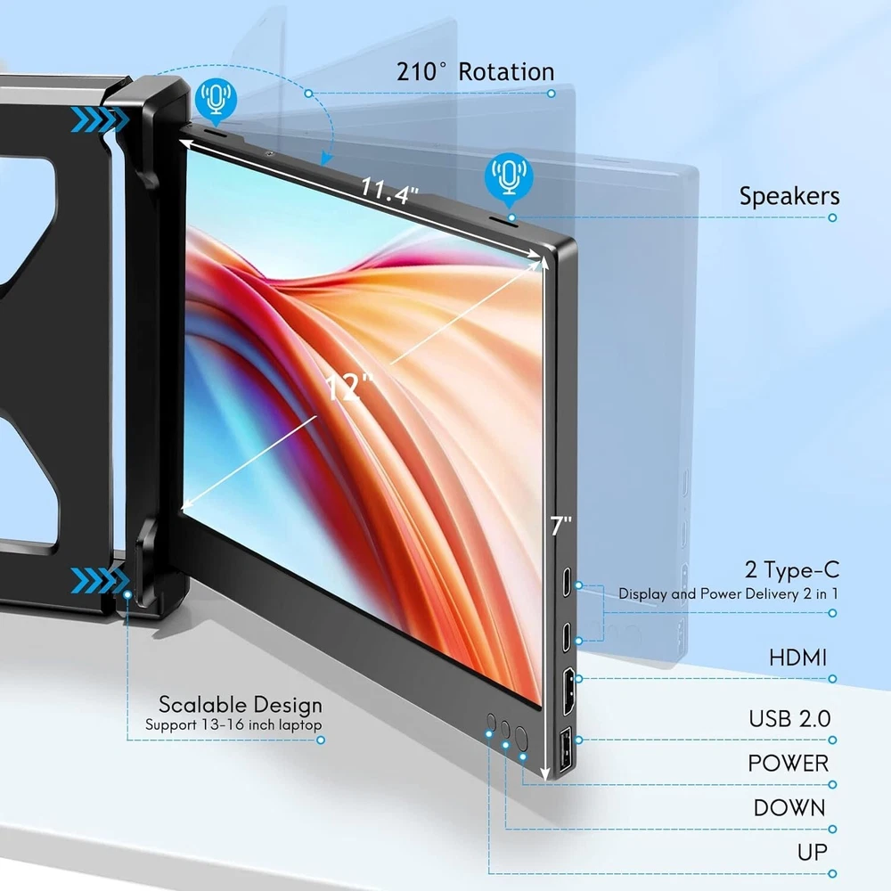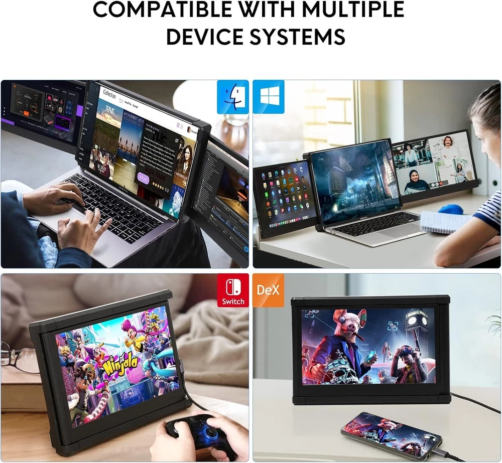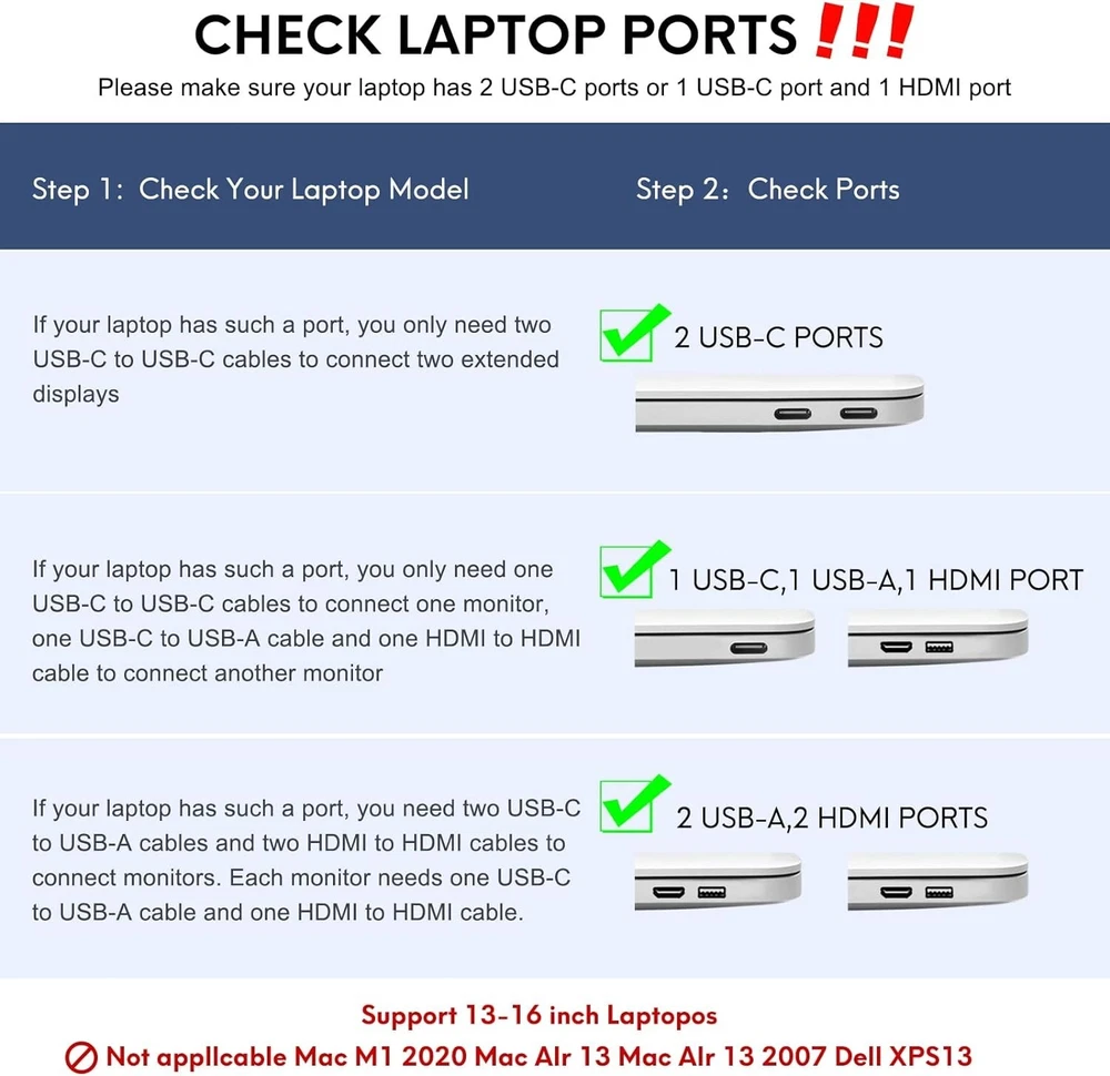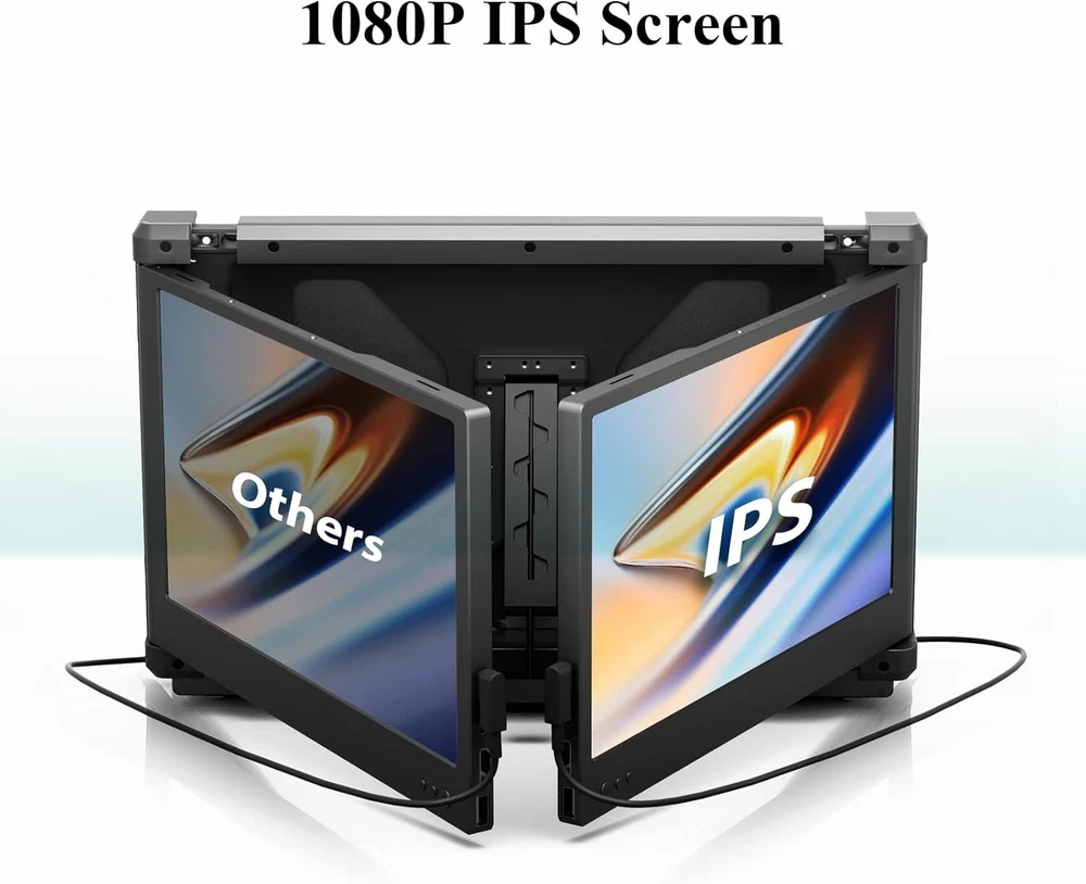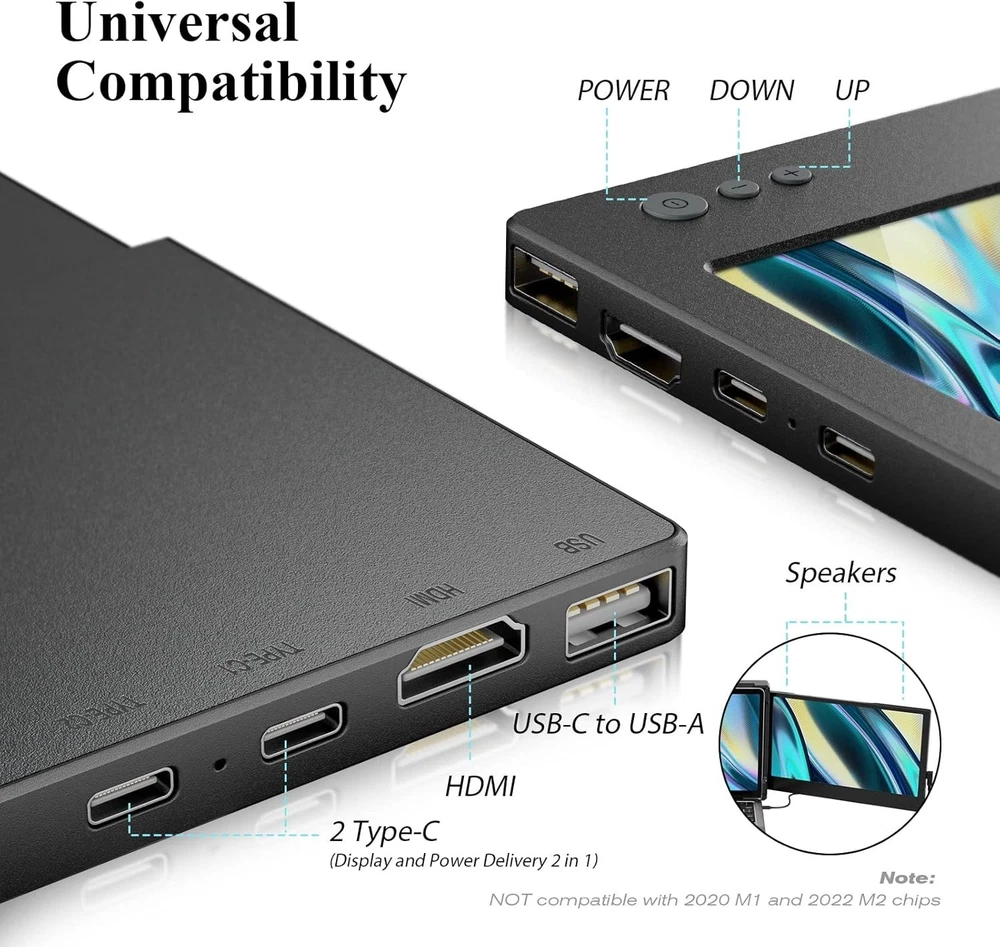1080P Full HD Screens Equipped with an IPS panel with 1920*1080 Full HD resolution, this portable 12-inch dual-screen monitor has an extraordinary image and clear video quality. Ports and Buttons Dual Speakers/Type-C*2/HDMI/USB 2.0/SET UP/ Up /Down (Every screen). Adjust the parameters set for each screen according to your preferences, such as brightness, saturation, hue, backlight, etc. Lightweight and portable It is easy to put in your backpack or computer bag without having to buy other extra bags, easy to fold and take along, build your own workstation whenever and wherever possible. Read the following pictures carefully and check your computer model.(Attention!!Not Compatiable With 2020 Macbook with M1 Chip and 2022 with M2 Chip!) Connection Method (Attention!!Not Compatiable With 2020 Macbook with M1 Chip and 2022 with M2 Chip!) ( Notice: Please make sure your laptop has either 2 USB-C ports (data&power transmission) or 1 USB-C port (data&power transmission), 1 USB-A,1 HDM1 port, or 2 USB-A ports and 2 HMDI ports.) If your laptop has two Type-c ports, you only need two USB-C to USB-C cables(supports display and power delivery 2 in 1) to connect two extended displays If your laptop has a Type-c port (supports display and power delivery 2 in 1), an HDMI port, and a USB-A port, you only need one USB-C to USB-C cable to connect one monitor, one USB-C to USB-A cable and one HDMI to HDMI cable to connect another monitor If your laptop has two HDMI ports and two USB-A ports and no Type-c ports, you need two USB-C to USB-A cables and two HDMI to HDMI cables to connect monitors. Each monitor needs one USB-C to USB-A cable and one HDMI to HDMI cable. Please read carefully before purchasing, so as to enjoy a better shopping experience. The following situations are not the quality problems of the product itself, but the problems of some models of laptops that are incompatible with OFIYAA P2: Some old models of laptops cannot be used because they do not have any HDMI or Type-C port and cannot be connected to OFIYAA P2. Even if you can connect the OFIYAA P2 with a HUB, there is only one video signal which will make the two screens of the P2 display exactly the same content. Due to some laptops' insufficient voltage, when connected to OFIYAA P2, one screen will work normally and another one not. You can try to use an additional USB cable to power the screen. Some brands of new laptops(Like Macbook M1 chipset models)have two TYPE-C ports in configuration, but only one port can output video in function, which makes them only support one screen expansion. FAQ: Q1: The 2nd screen didn't come on? The second screen does not connect to the laptop? One screen works and the other doesn't? A: Please do a test with a different laptop: (1) Determine whether the laptop computer voltage is sufficient? You can try other USB cables to power the screen. (2) Determine whether the Type C port of some computers has only one output signal, such as the new Mac. Q2: The screen does not light up after connecting the screen expansion? A: Check if your laptop USB-C port supports display and power delivery 2 in 1, if the port does not support it, Please use the included HDMI cable and USB-C to USB-A cable(or Type-c cable) to connect the screen expansion. The power of some models of laptops cannot reach the standard power of the screen expansion. Please use the included USB-C cable to connect the Charging plug, and connect to the Type-c port of the screen expansion to power the screen. Q3 : Which sizes of laptops are suitable for the OFIYAA P2 tri-screen monitor extender? A: OFIYAA P2 screen extender supports 13-16 inch laptops. If you are not sure your laptop is compatible with OFIYAA P2 Triple portable monitors, Please feel free to get more detailed information from us.