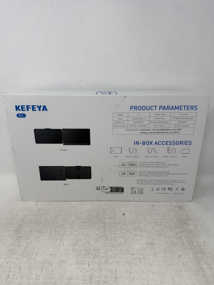 Brand: Kefeya Display Type: LCD Screen Size: 14 in Features: Portable Aspect Ratio: 16:9 Refresh Rate: 60 Hz Product Line: Kefeya Model: S1
