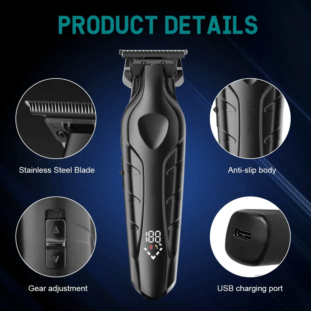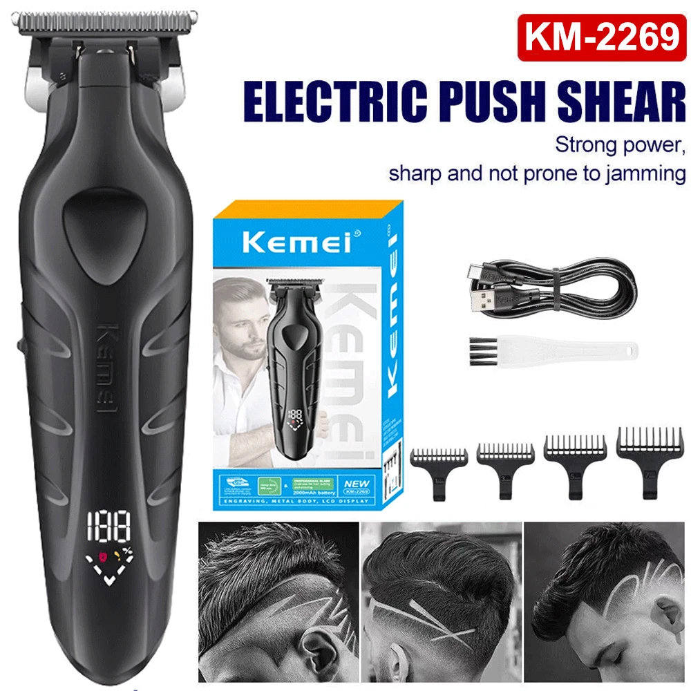 Description Model: KM-2269 Power: 5W Battery capacity: 2000mAh Charging time: 3 hours Usage time: 300 minutes Charging type: USB charging - Professional trimmer hair finishing machine designed for men, the Kemei KM-2269 features a high-performance T-Blade providing precise and smooth cutting. - Equipped with a powerful 7500RPM motor for fast and efficient trimming, ensuring a clean and sharp look in no time. - The digital LCD Display allows for easy monitoring of battery life and speed settings, enhancing user convenience and control. - With a USB Interface for quick and convenient charging, the Kemei KM-2269 ensures a reliable power source whenever needed. - Crafted with a durable and sharp ceramic blade, along with zero gap adjustment for maximum precision and cutting efficiency, making it the ideal choice for professional grooming needs. Package list 1 x machine 4 x limit combs 1 x brush 1 x charge cable Note: Due to the limitation of air transport, this product does not contain oil,Please understand. If you have any questions, please feel free to contact us, please do not leave any negative feedback, we will deal with it as soon as possible, thank you