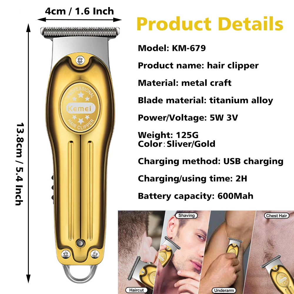 Description Model: KM-2269 Power: 5W Battery capacity: 2000mAh Charging time: 3 hours Usage time: 300 minutes Charging type: USB charging - Professional trimmer hair finishing machine designed for men, the Kemei KM-2269 features a high-performance T-Blade providing precise and smooth cutting. - Equipped with a powerful 7500RPM motor for fast and efficient trimming, ensuring a clean and sharp look in no time. - The digital LCD Display allows for easy monitoring of battery life and speed settings, enhancing user convenience and control. - With a USB Interface for quick and convenient charging, the Kemei KM-2269 ensures a reliable power source whenever needed. - Crafted with a durable and sharp ceramic blade, along with zero gap adjustment for maximum precision and cutting efficiency, making it the ideal choice for professional grooming needs. Package list 1 x machine 4 x limit combs 1 x brush 1 x charge cable Note: Due to the limitation of air transport, this product does not contain oil,Please understand. If you have any questions, please feel free to contact us, please do not leave any negative feedback, we will deal with it as soon as possible, thank you