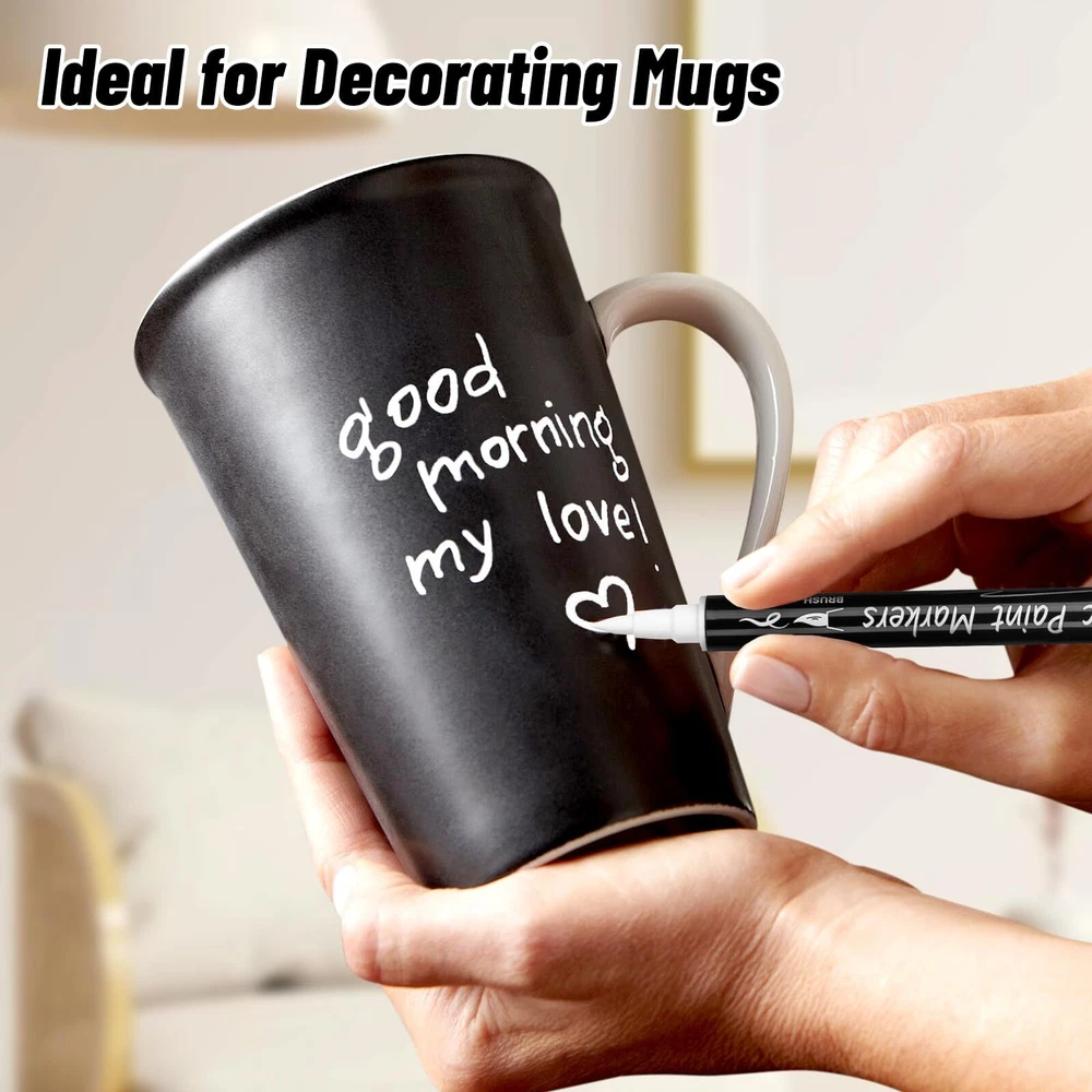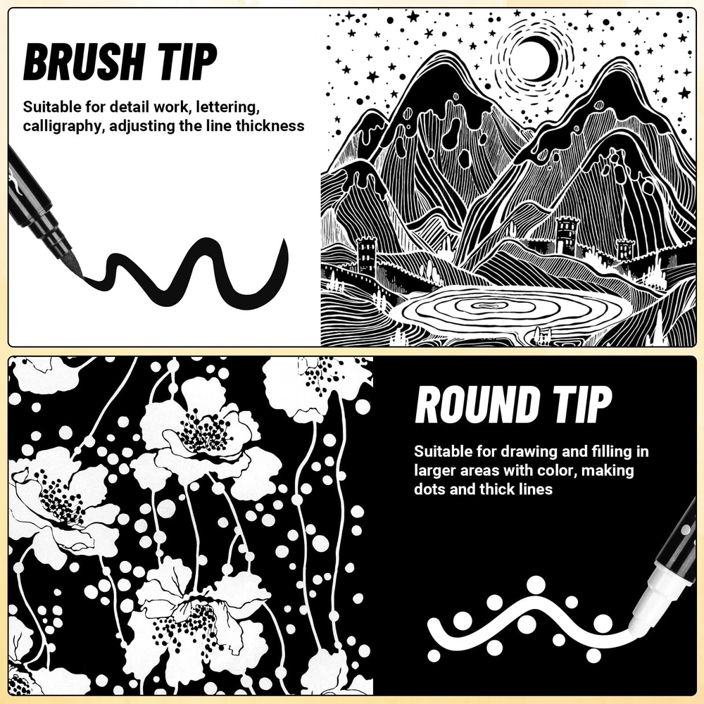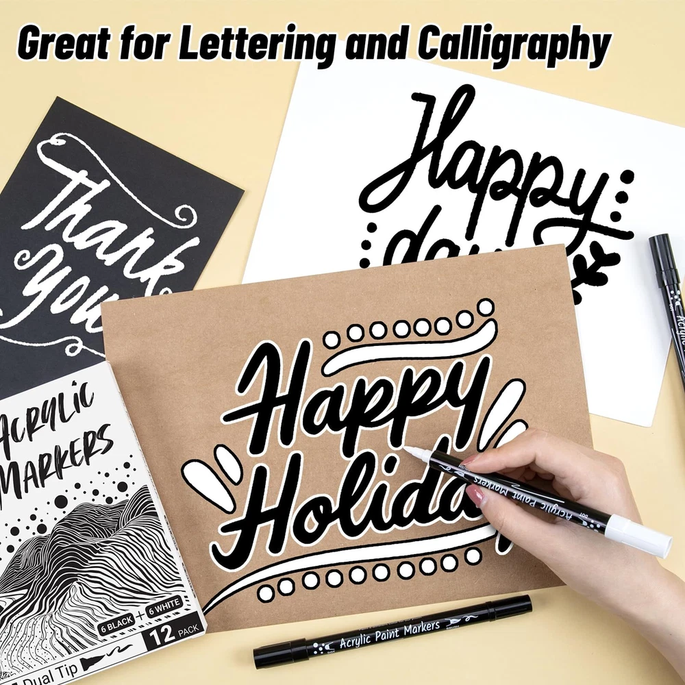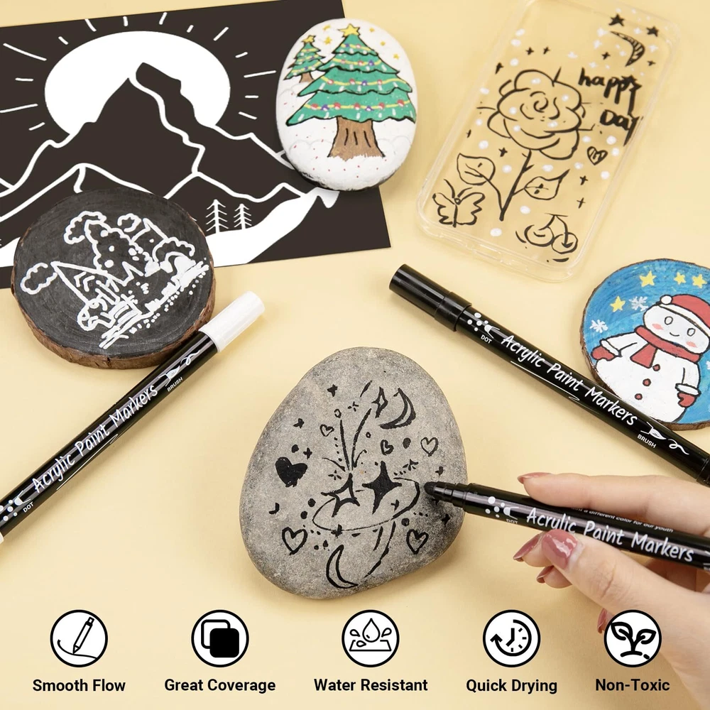 【Acrylic Paint Markers Dual Tip】The black and white acrylic paint pens feature a novel dual tip design, with a 0.5-5mm brush tip on one end for detailing, lettering, calligraphy, adjustable line thickness; and a 3mm round tip on the other end for large scale painting and coloring, making dots and thick lines. These black white acrylic paint pen can meet your creative needs to make your own DIY projects. 【Great for Lettering and Calligraphy】The black white brush pen can be used for lettering and handwriting, you can control the paint markers brush tip as you like to write interesting fonts, you can use it on vellum and cardboard, use it for labeling paper for label sorting, and use the white markers for black paper, for signing at work and in daily life. The round tip of the marker is suitable for embellishment and tracing, and can easily draw a variety of different sizes of dots at different pressures, which can give your art lettering more three-dimensional. 【Open and Use Directly】Those dual tip acrylic paint pens are easy to use, without and shaking or priming, just pop the cap and get to work. The white paint pens paint markers can be used on a variety of flat surfaces, the ink comes out smoothly, dries quickly, great for family fun, and easy for kids can be used as markers for rock painting or paint markers for wood. The colour will not change even if the DIY artwork you have created is left outside. 【Suitable for Mutil-Surfaces】black and white paint markers have great coverage and will show color when applied to rock, wood, glass, canvas, plastic, ceramics, cardstock and black paper. You can use them on dried watercolour paintings to depict your desired pattern or overlay colours. These white acrylic paint markers dual tip can be used as gifts for Easter, Halloween, Christmas, can be used to paint on stones, make Easter eggs and pumpkins. 【Tips for Storage and Use】When storing brush tip acrylic paint markers it is recommended to place them horizontally, to be able to have a more even powder on both ends, and it is recommended to test them in a test area before applying to avoid uneven ink application. Use the black and white acrylic paint pens on a smooth, non-absorbent surface, and if you accidentally make a mistake, wipe it off with alcohol or a damp cloth within 10s of marking. 【Purchase without Risk】Acrylic paint pens dual tip are made of water-based opaque ink, safe, non-toxic and odorless, the design of white paint pens for wood brings more convenience for creativity, help you paint, calligraphy, embellish and trace, ideal gift for kids, family, friends and workmates. If you have any questions before or after ordering, please contact us through "Message from buyer and seller".