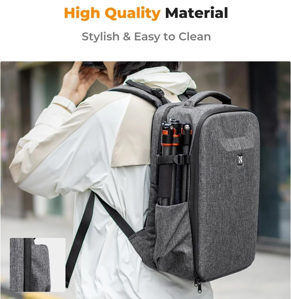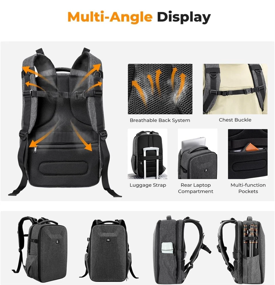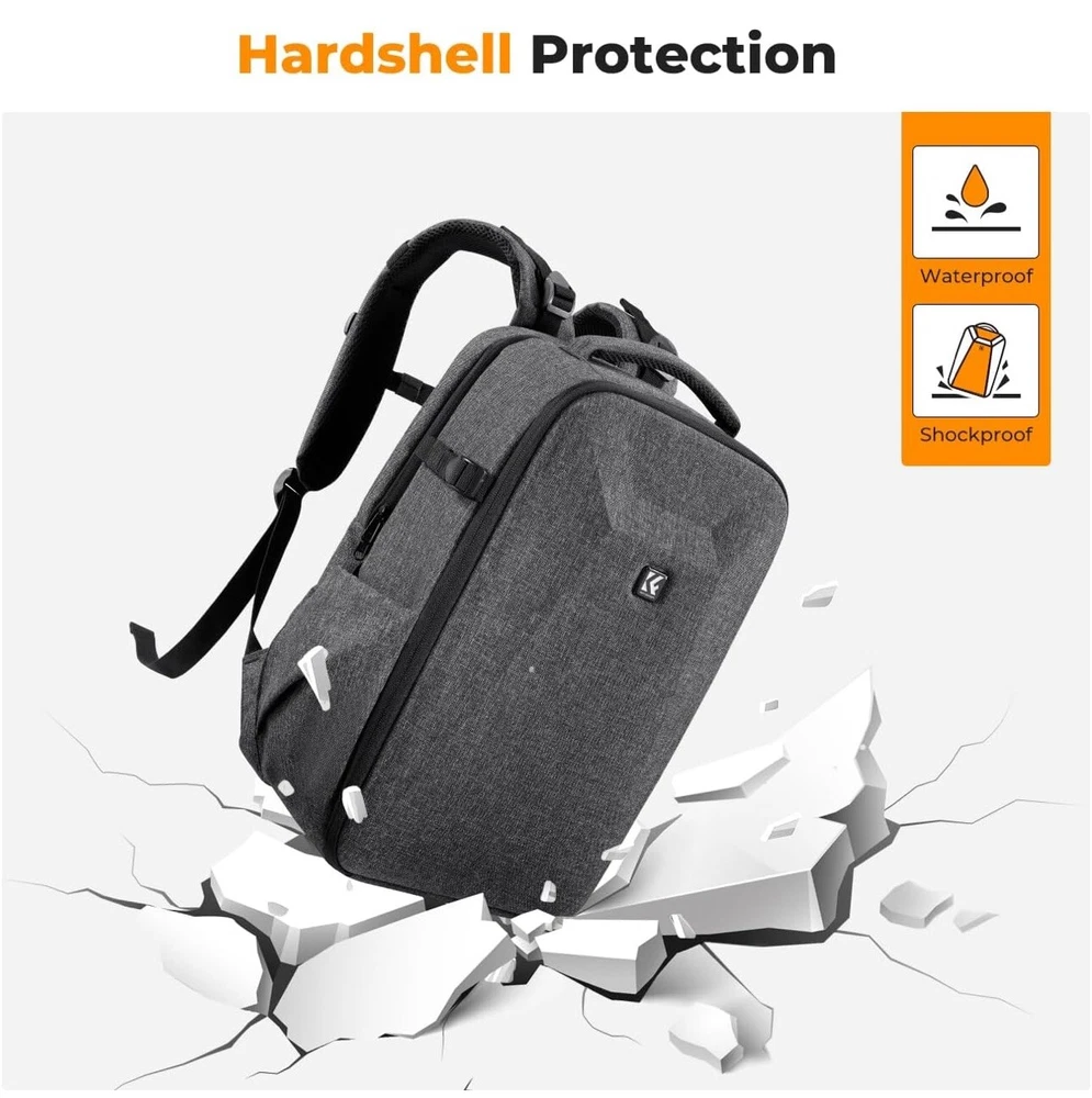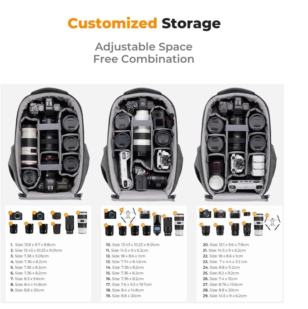 Dimensions: 17.3 x 11 x 7 inches. Capacity: 22 liters. This multifunctional rigid camera backpack is designed for different brands of DSLR/SLR/SLR/mirrorless cameras. Removable modular inserts as custom dividers for different cameras, flashes and lens. The back pocket is a laptop compartment that can store up to 15.6 inches of laptop. Fully open design: fully open front flap designed with hard case, which prevents your camera from hitting and scratching. Camera bag with 2 internal pockets for accessories that can store cables, SD cards, power bank. 1 hidden zippered pocket on the back for your phone, wallet and other small items you need to store. The tripod holder comes with 1 secure strap on one side of the bag. 1 pocket on the other side can store umbrella or water bottle. Front hard shell protection: this rigid camera backpack is made of EVA rigid cover, all in one piece, the padded foam layer can provide good cushioning and protection to your internal things against bumps and drops. Comprehensive protection for your camera and drone equipment. Easy-to-use design: Ergonomically breathable padded mesh back panel and shoulder strap (adjustable from 20 to 38.9 inches) are designed for comfortable carrying, distribute weight evenly and reduce the load on your shoulder. Elegant camera bag: the back belt makes it convenient during the trip. Our camera bags are perfect for travel and offer practical features for the photographer and camera enthusiasts. If you have any questions about the product, do not hesitate to contact us.