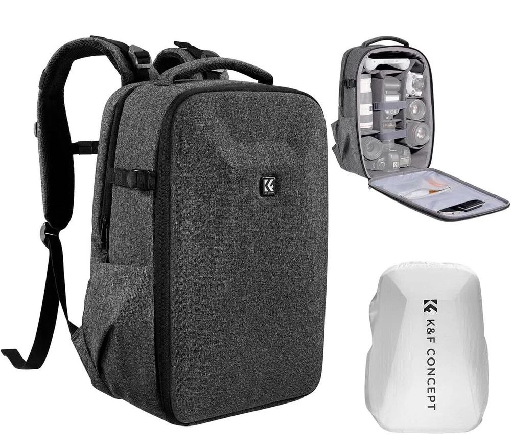 Dimensions: 17.3 x 11 x 7 inches. Capacity: 22 liters. This multifunctional rigid camera backpack is designed for different brands of DSLR/SLR/SLR/mirrorless cameras. Removable modular inserts as custom dividers for different cameras, flashes and lens. The back pocket is a laptop compartment that can store up to 15.6 inches of laptop. Fully open design: fully open front flap designed with hard case, which prevents your camera from hitting and scratching. Camera bag with 2 internal pockets for accessories that can store cables, SD cards, power bank. 1 hidden zippered pocket on the back for your phone, wallet and other small items you need to store. The tripod holder comes with 1 secure strap on one side of the bag. 1 pocket on the other side can store umbrella or water bottle. Front hard shell protection: this rigid camera backpack is made of EVA rigid cover, all in one piece, the padded foam layer can provide good cushioning and protection to your internal things against bumps and drops. Comprehensive protection for your camera and drone equipment. Easy-to-use design: Ergonomically breathable padded mesh back panel and shoulder strap (adjustable from 20 to 38.9 inches) are designed for comfortable carrying, distribute weight evenly and reduce the load on your shoulder. Elegant camera bag: the back belt makes it convenient during the trip. Our camera bags are perfect for travel and offer practical features for the photographer and camera enthusiasts. If you have any questions about the product, do not hesitate to contact us.