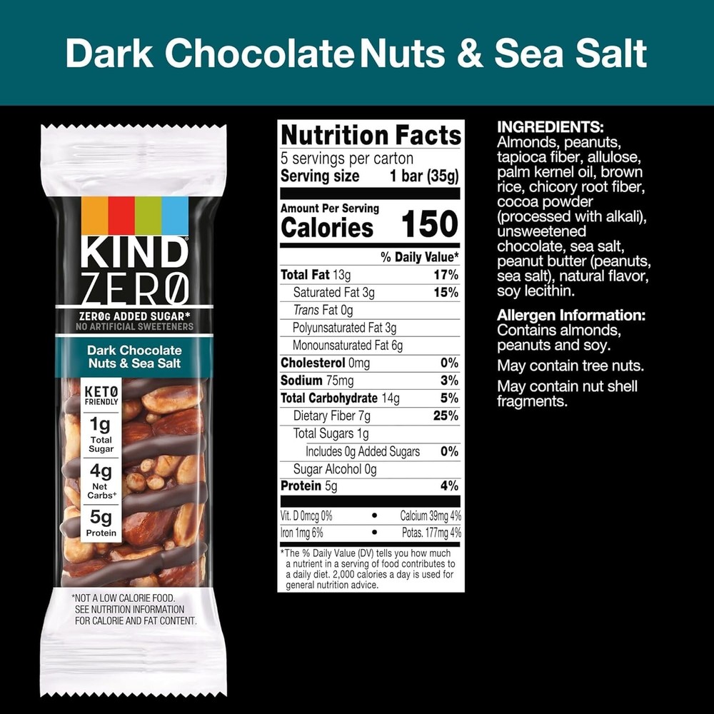 Contains five (5) KIND ZERO Added Sugar Bars; 1 ingredient almonds Keto friendly bars have4g net carbs, 5g protein and 1g total sugar per serving; 0g added sugar (Not a low-calorie food. See nutrition information for calorie and fat Made with nutrient-dense almonds and peanuts, plus chocolatey top drizzle and bottom coating Enjoy as a nutritious on-the-go snack any time of day No artificial sweeteners or sugar alcohols; Non-GMO Project Verified; low sodium; Kosher