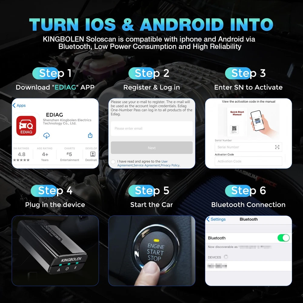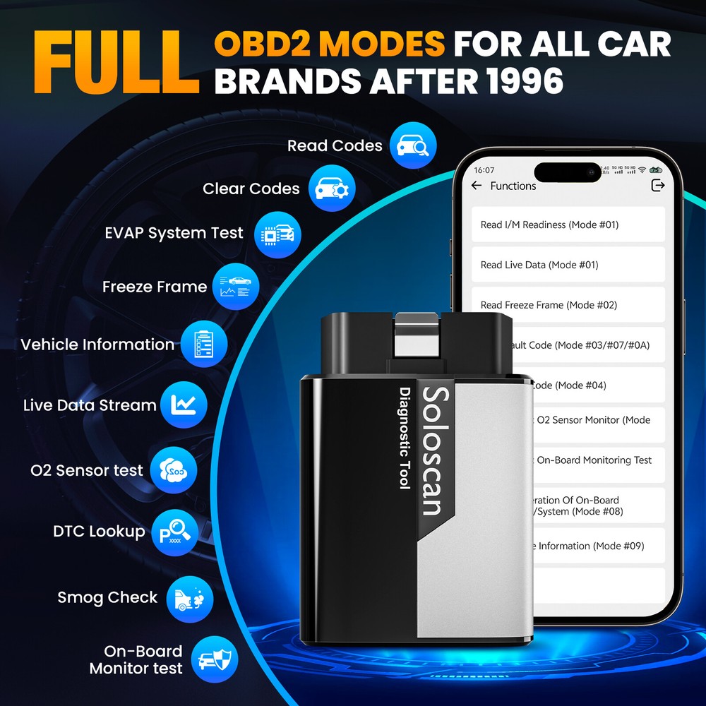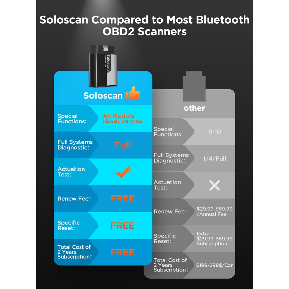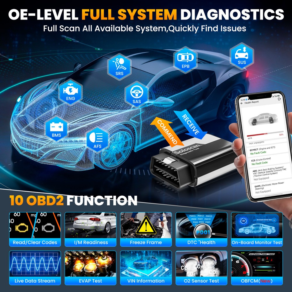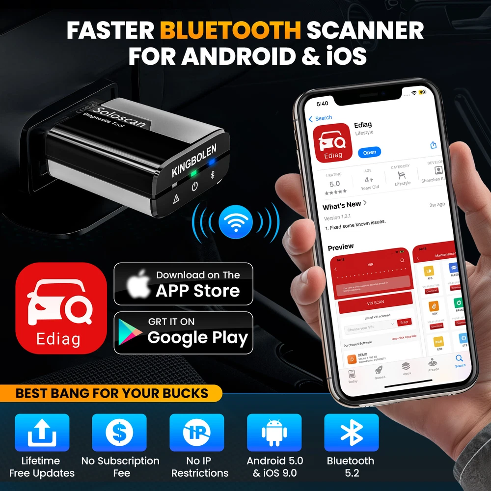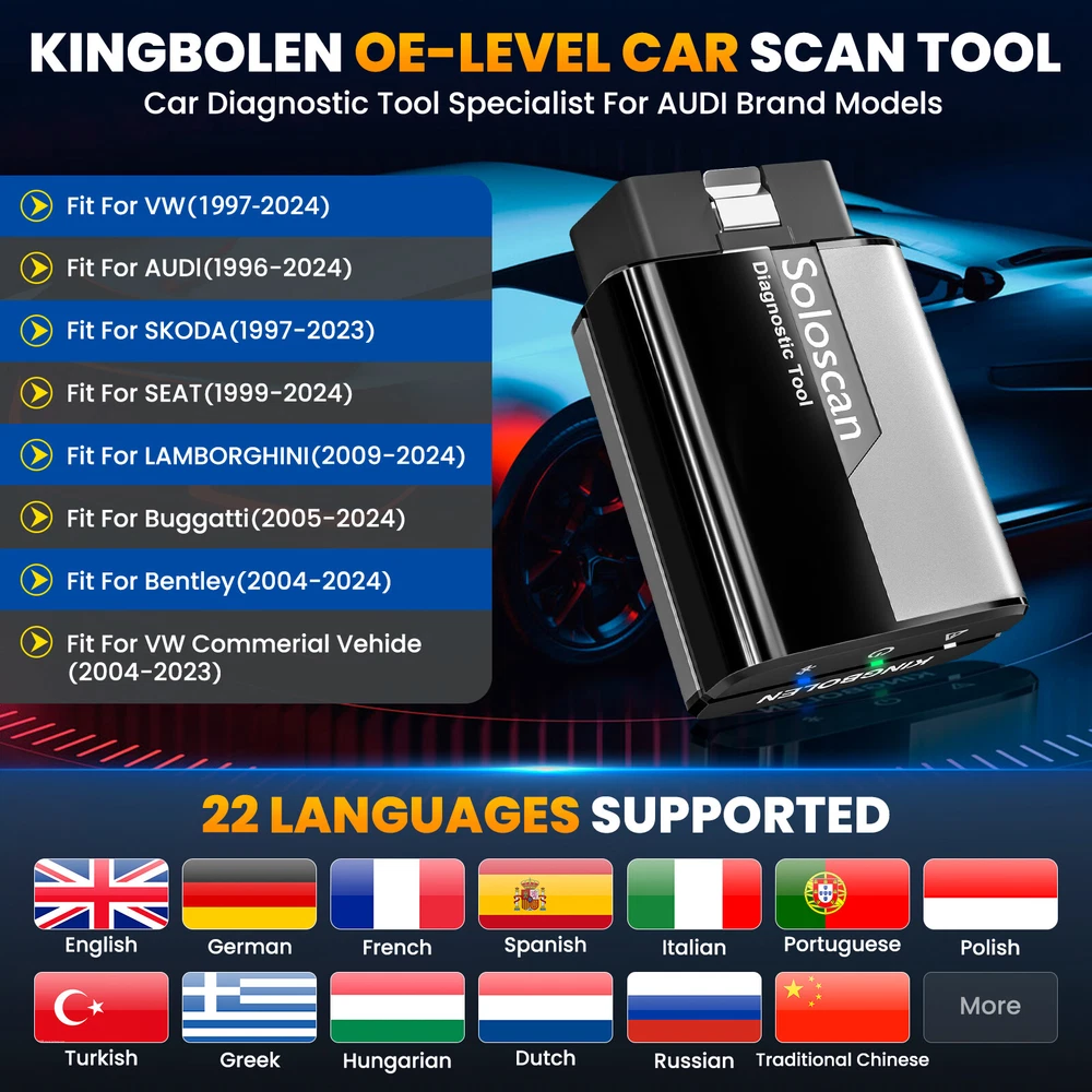 NEW Arrival ---HOT Soloscan Lifetime Free Update All System OBD2 Scanner Full Car Manufacture Brands Softwares + ALL Reset Functions + ECU Coding +BI -Directional (Active Test) +Auto VIN FOR AUDI 🔥🔥🔥Lifetime Free Update ,Best choose for DIYer Why Is The Kingbolen Soloscan Diagnostic Scanner Tool Is So Powerful And Reliable? 1,Lifetime Free update 2,Advanced ECU Coding 3,Full Bidirectional Control 4.Lifetime Free WiFI Updates 5,OE-Level Full Systems Diagnosis 6,Useful All Special Reset 7,Full OBD2 functions for All Cars 8,Auto Vin & Auto Scan for quick diagnostics 9,One-Click Automatically Generate Health Reports in a local file 10,4-in-1 Graphing Merge Display 11,Data Record, Replay & Screenshot; Diagnostic Report Share and Print 12,Online Feed-back; Battery Voltage Monitor 13,DTC LookUp and etc. 14,22 Languages option, including English, French, Spanish, German, Italian, Portuguese, Japanese, Russian, Polish, Traditional Chinese, Turkish, Greek, Korean, Hungarian, Dutch, Vietnamese, Arabic, Persian, Khmer, Lao, Burmese, Thai Supports 22+ Languages : English, French, Spanish, German, Italian, Portuguese, Japanese, Russian, Polish, Traditional Chinese, Turkish, Greek, Korean, Hungarian, Dutch, Vietnamese, Arabic, Persian, Khmer, Lao, Burmese, Thai Support 99% Car Modles (Cover 100000+ Models ) For OBDII diagnostics, the obd2 code reader works great for most cars built in 1996 or later, being compatible with following protocols: -ISO 14230-4 (KWP2000) -ISO 15765-4 (CAN) -ISO 9141-2 (iso) -ISO 14229 (uds) -SAE J1850 (VPW & PWM) -Original protocols of makers OE-LEVEL All Systems Diagnostic(Lifetime Free update ) can perform OE-level diagnostics on all systems,such as ABS,SRS,Engine,Transmission,Wiper,Seat,EPB,TPMS,Body System,AWD,Door Lock System, Battery,ESP, Parking Sensor, Cruise Control, Instrument, etc. Support ALL Maintenance Functions:(Lifetime Free update ) 1.Oil Reset Service 2.Steering Angle Calibration 3.Electronic Parking Brake Reset 4.Battery Register & Battery Maintenance 5.ABS Bleeding 6.Electronic Throttle Position Reset & Learn 7.Diesel Particulate Filter (DPF) Regeneration 8.Tire Pressure Monitor System Reset 9.Anti-theft Matching 10.Injector matching 11.Air Suspension Reset 12. Gearbox Reset 13.Sunroof RESET 14.AFS Reset 15.EGR Reset 16.Seats Calibration 17.Tyre Reset 18.Coolant Bleed 19.AdBlue Reset (Diesel Engine Exhaust Gas Filter) 20.NOx Sensor Reset 21.Ac System Initialization 22.High Voltage Battery Detection 23.Windows Calibration 24.Language Change 25.AF Reset 26.Transport Mode 27.StoplStart Reset 28.Intelligent Cruise Control System Reset 29.Engine Power Balance Monitoring 30.Gas Particulate Filter (GPF) Regeneration 31.Motor Angle Calibration Updating.... ECU Coding (Customize) Lifetime Free Update ECU CODING allows you to match the replaced components with ECU, flash hidden functions for AUDI. No matter you are private owner or professional technician, Thinkdiag is a powerful and handy scanner tool. Uses the Ediag App to modify the adaptive data for vehicle control modules, after repairs or replacements of vehicle parts including: [ Power Window | Illuminated Entry | Warning | Light Control | Slide Roof | Air Conditioner | Display | Unit Conversion | Entry & Start | PSD & PBD Operation | Seat … ] Bi-Directional(Active Test) Lifetime Free Update Test the actuator. The decoder can be used to send instructions to the actuator through the vehicle APP and execute the corresponding actions. For example, the injector sprays oil, the throttle opens, the radiator fan runs, etc Support 10 OBD2 Full Function(Lifetime Free update ) This diagnostic software can test vehicle Engine systems.All models with engine meeting SAE J1850,ISO9241-2,ISO14230-4,ISO15765 Standard in OBD2&EOBD. 1.View freeze frame date 2.support graph data stream 3.O2 Sensor test 4.Evap system test 5.On-Board monitor test 6.Read & Clear DTCs 7.Identify VIN information 8.DTC code look up 9.Turn off MIL(Malfunction Indicator Lights) 10.I/M Readiness status test KINGBOLEN SOLOSCAN OTHER FUNCTION : 1. Auto VIN Scan 2. 4-in-1 Live Data Stream 3. DTC Look up 4. Remote Diagnose Function 5. Diagnostic Report 6. Diagnostic Report print & Share 7. Online Repair Sources Support Mobile Phone & Tablet Computer Android: 4.0, IOS: 9.0 KINGBOKEN Soloscan OBD2 Diagnostic Tool is suitable for Mobile phones, tablet computer that meet the above version information. When the adapter is connected to the car, you only need to detect and diagnose your vehicle through the mobile phone's Bluetooth 4.2 and APP. It is suitable for most DIY car owners and maintenance and repair car stores on the market. KINGBOLEN SOLOSCAN Parameter : Supported systems: (Android 5.0/iOS 9.0 or above) Bluetooth: Version 5.2 Storage temperature: -20°C-60°C Working temperature: -10°C~50°C