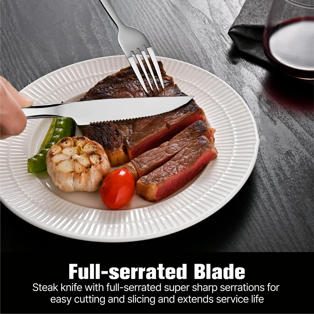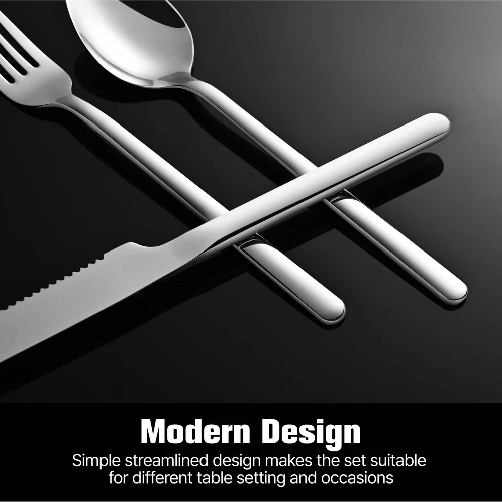 KINGSTONE 24-Piece Silverware Set with Steak Knives, Flatware Set for 4, Stainless Steel Tableware Cutlery Set for Home Restaurant, Mirror Finish,Modern Design Product Details Color: Silver Size: 24pcs with Steak Knives Brand: KINGSTONE MPN: Does not apply UPC: Does not apply EAN: Does not apply Brand: KINGSTONE Number of Pieces: 24 Material: Stainless Steel Color: Silver Product Care Instructions: Hand Wash for Steak Knives, Dishwasher Safe Recommended Uses For Product: Indoor Special Feature: Corrosion Resistant Finish Type: Polished Included Components: 4 dinner forks, 4 salad forks, 4 dinner knives, 4 steak knives, 4 dinner spoons, 4 teaspoons Style: Contemporary Brand: KINGSTONE Number of Pieces: 24 Material: Stainless Steel Color: Silver Product Care Instructions: Hand Wash for Steak Knives, Dishwasher Safe Recommended Uses For Product: Indoor Special Feature: Corrosion Resistant Finish Type: Polished Included Components: 4 dinner forks, 4 salad forks, 4 dinner knives, 4 steak knives, 4 dinner spoons, 4 teaspoons Style: Contemporary Is Stain Resistant: Yes Is Dishwasher Safe: Yes Manufacturer: KINGSTONE Package Dimensions: 10.16 x 4.88 x 2.4 inches Item Weight: 3.23 pounds Country of Origin: China Date First Available: November 30, 2023 24PCS Silverware Set For 4 - Includes 4 dinner forks, 4 salad forks, 4 dinner knives, 4 steak knives, 4 dinner spoons and 4 teaspoons. This silverware set is great for everyday use and also for a special dinner. Essential for families or restaurants. Premium Stainless Steel - Our flatware sets are made of decent quality 18/10 stainless steel, nice balanced, sturdy and corrosion resistant. the steak knives made of German Stainless Steel to enhance its hardness for easy cutting and slicing. Original Steak Knives - 4 additional steak knives with sharp serrations on the blades help it easy to cut meat, and original design steak knives perfectly matched with the flatware set. Modern Design Cutlery Set- Mirror Polished Surface and Streamline Body Molding makes the cutlery set simple yet modern and easy to clean. Matches well with your existing flatware/dinnerware/tableware This shiny silver flatware set is perfect for Thanksgiving Day, Mother's Day, Housewarming, Wedding, Restaurant, Hotel or Daily Use. If you encounter any issue, just let us know and we always be ready to help